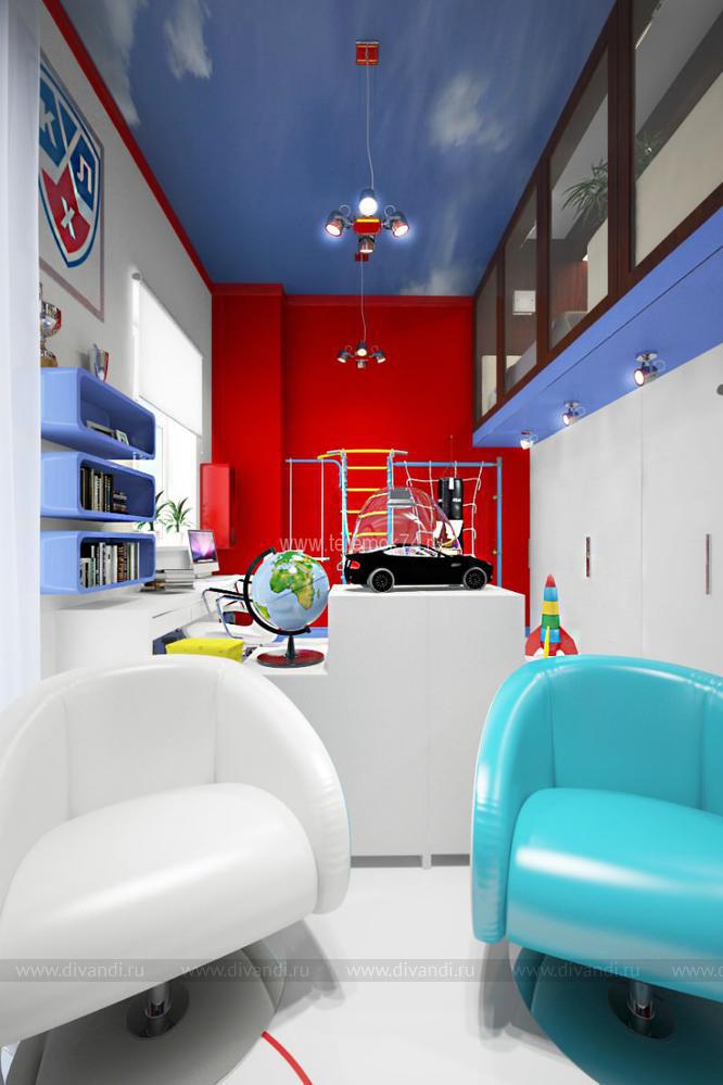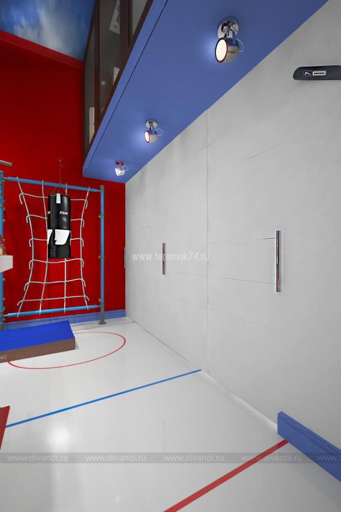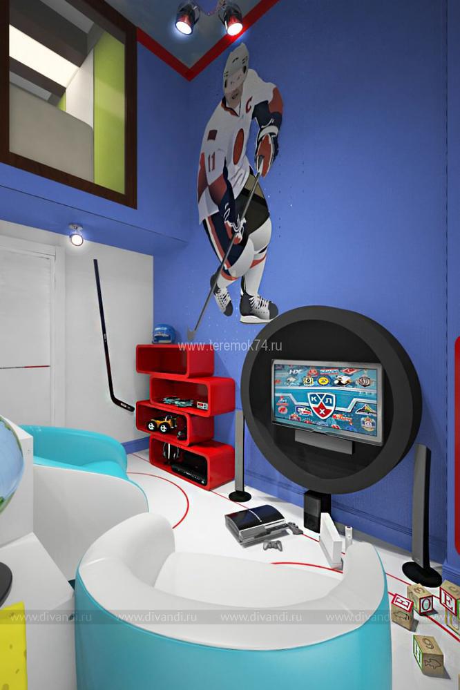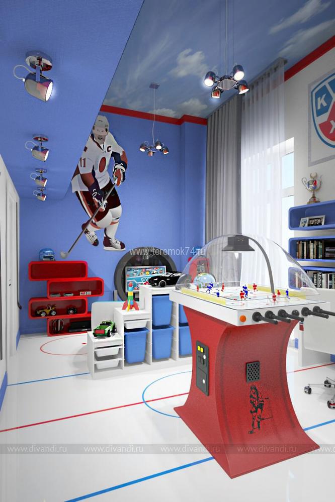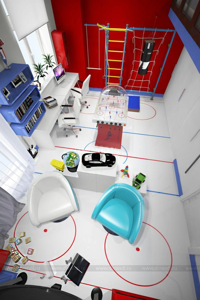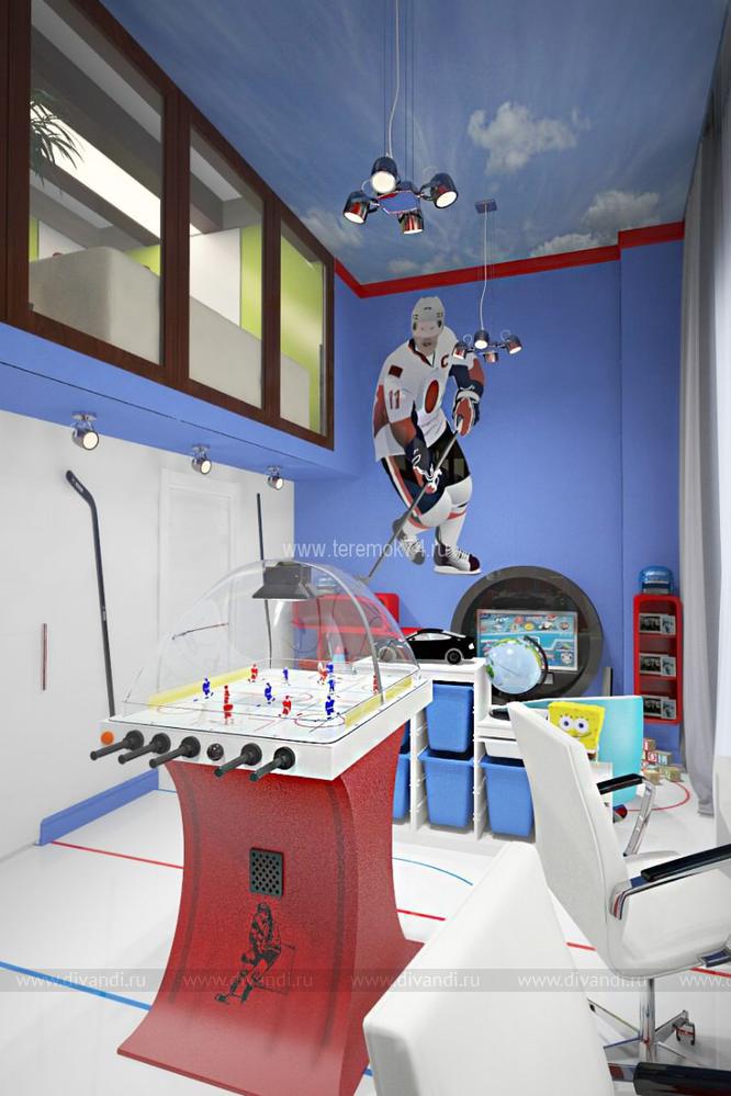 Особенностью этого проекта стала планировка и высота помещения. Этот интерьер находится в жилом комплексе «Лесопарковая». На первом этаже этой детской – игровая комната, на втором спальня. Владельцами этого интерьера станут 2 брата, увлекающиеся хоккеем. Помещение 1 этажа разделено на 2 группы: зона игр, где в центр телевизора выделен стилизованной шайбой под карбон, и учебной. Также на первом этаже мы разметили гардеробную. Вход на второй этаж находится в холле, что позволяет разделить эти 2 комнаты и сделать их полностью самостоятельными. Спальня на втором этаже имеет панорамное окно во всю стены – это стилизованная трибуна для просмотра матчей.