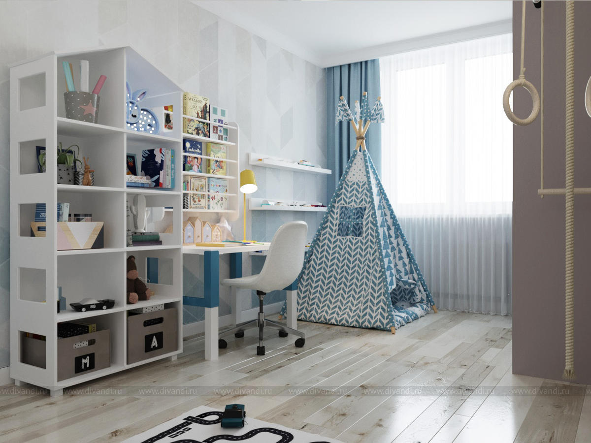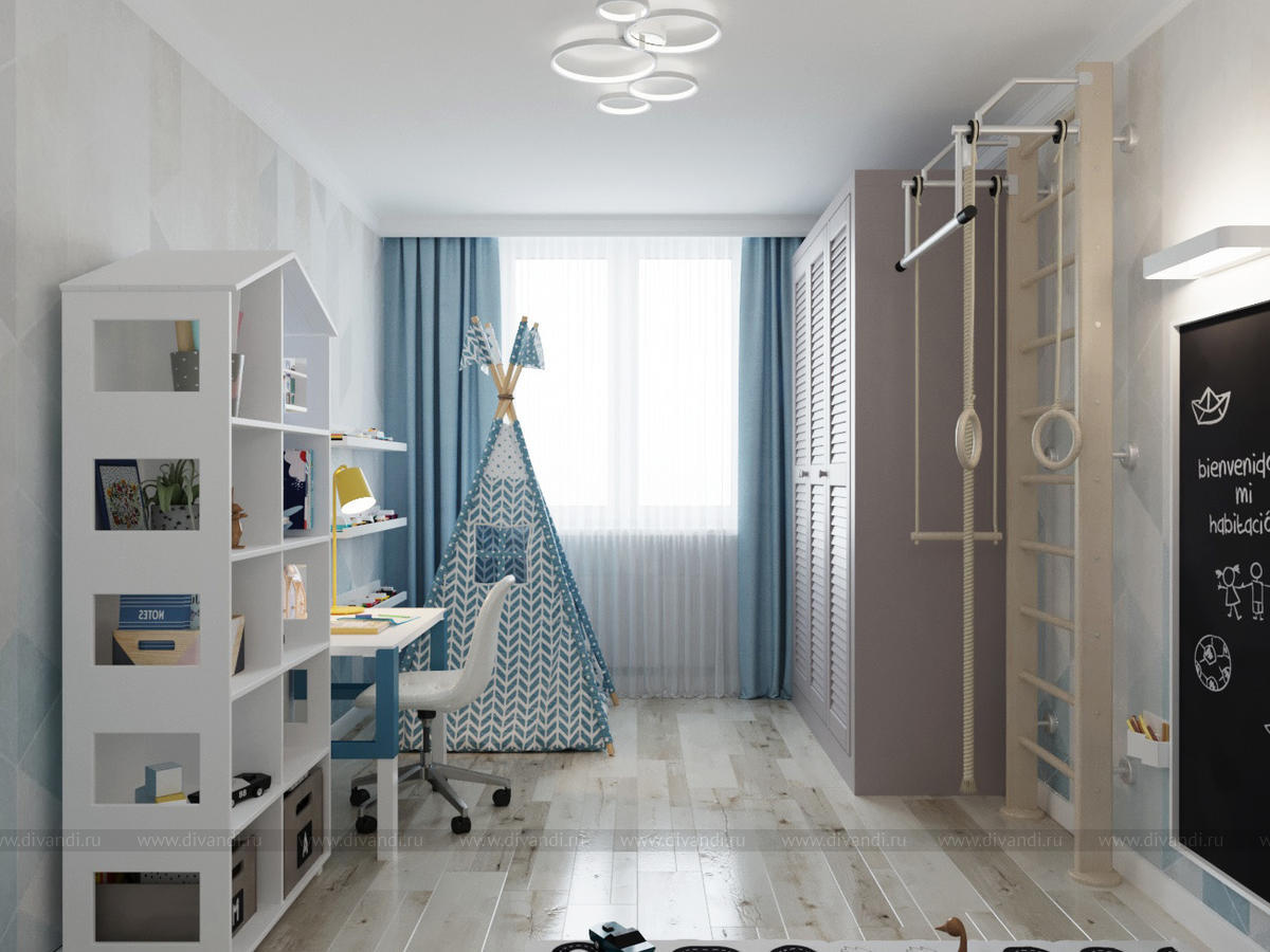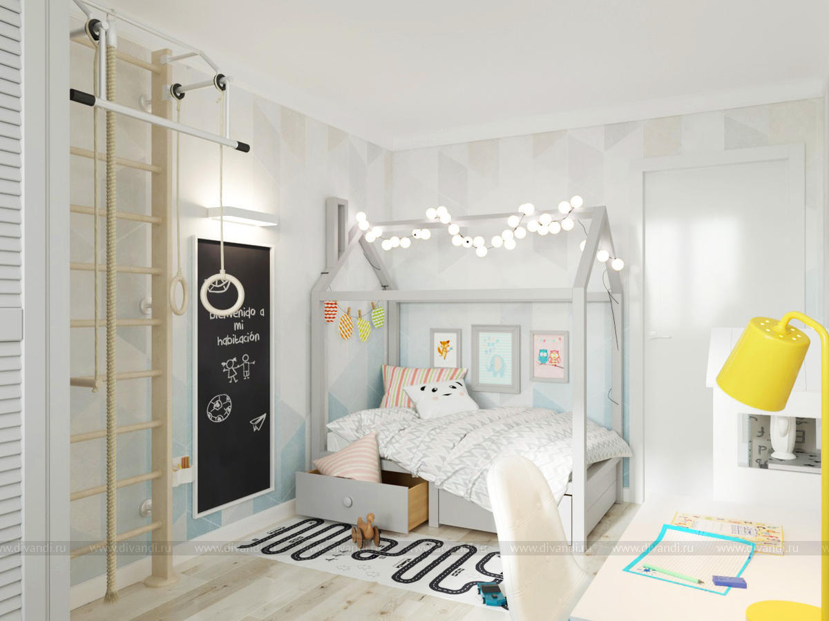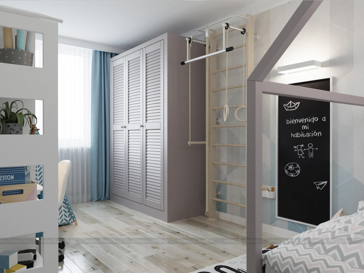 Детская мальчика в светлой цветовой гамме. Комната по площади небольшая, но здесь разместились все необходимые зоны - кроватка-домик, большой шкаф для одежды, спортивная стенка, грифельная доска, шатер для игр и много полочек для хранения игрушек.