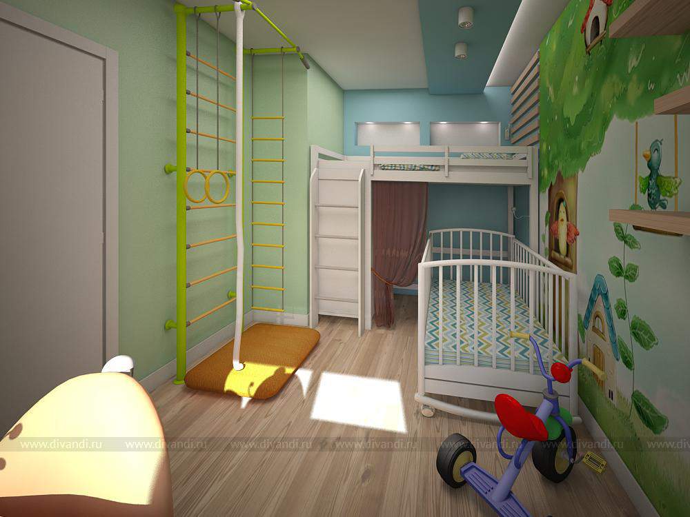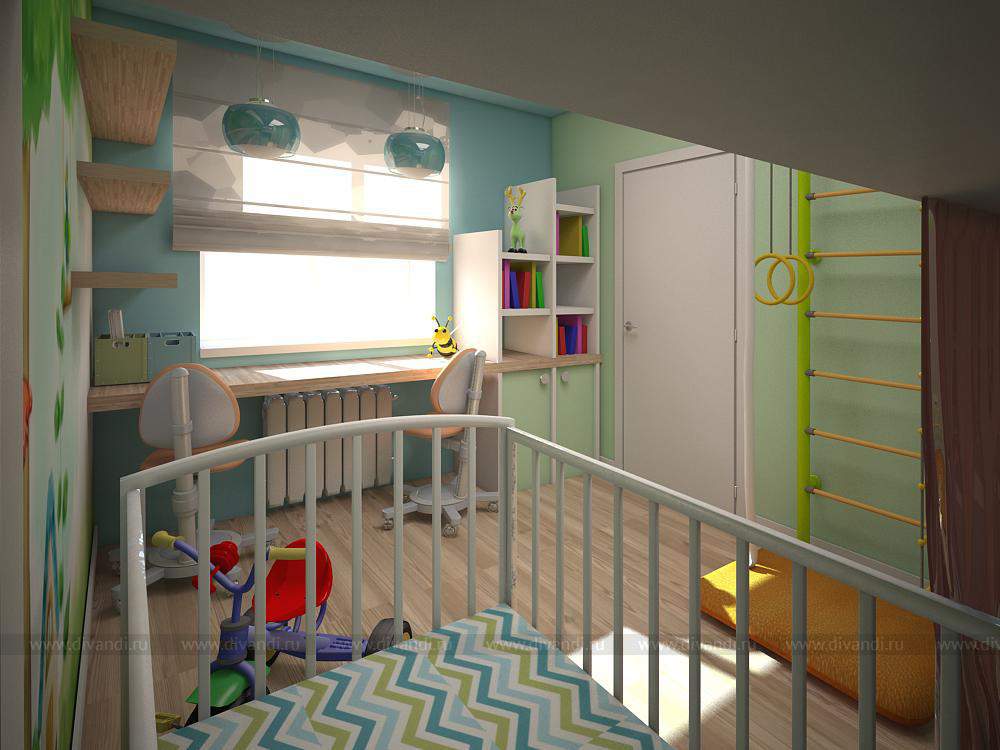 Универсальная "бесполая" детская в ярких тонах, настраивающая на игру и веселый дух. В маленьком пространстве (9 м) мы смогли уместить два спальных места, рабочую зону, шведский уголок и даже небольшой шкаф под одной из кроватей.
