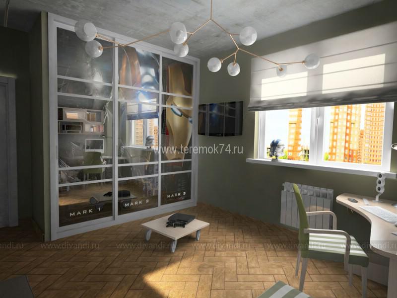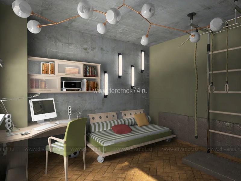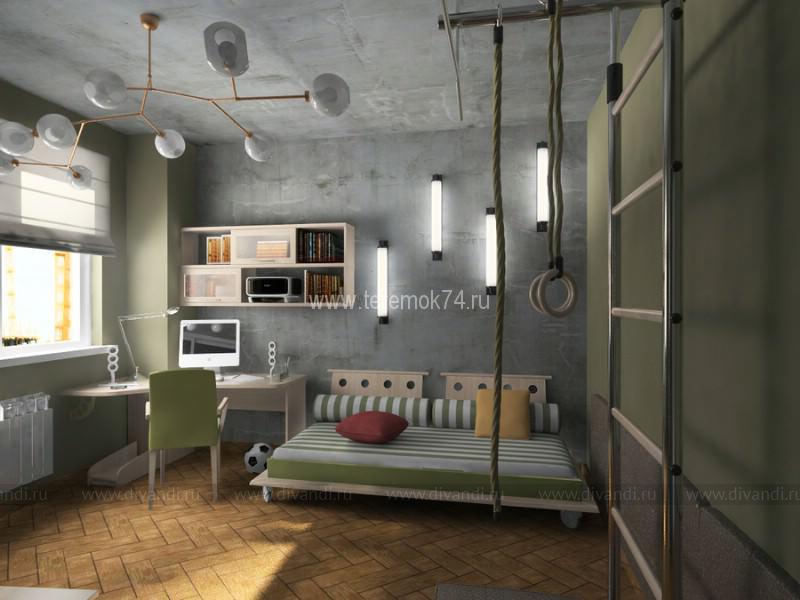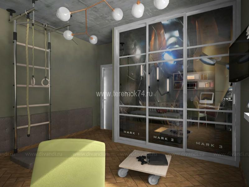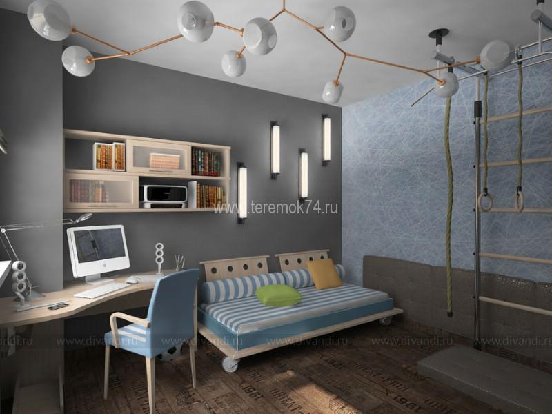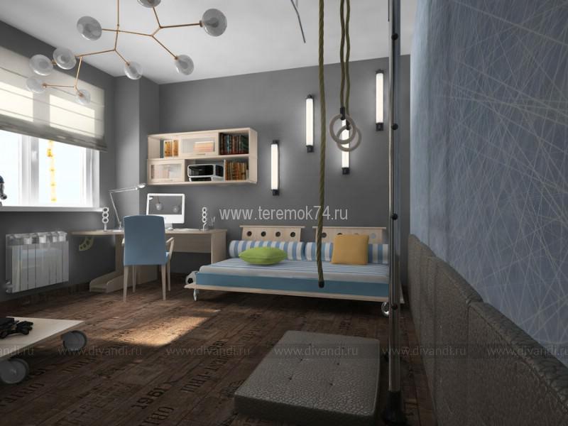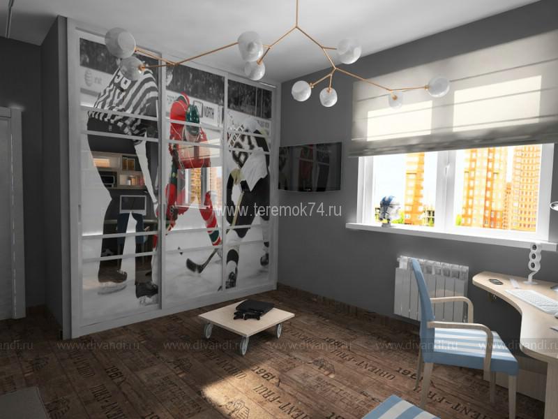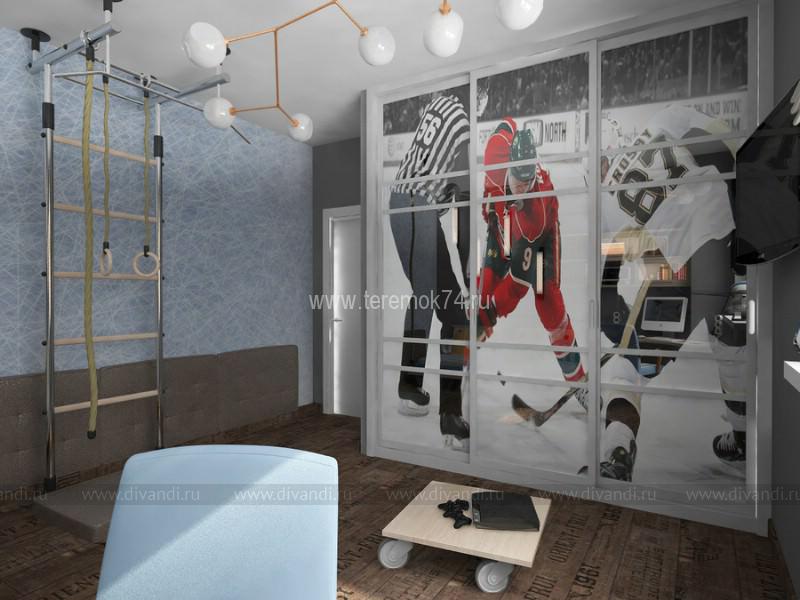 Детская для подростка разрабатывалась в двух вариантах, соответствующие его увлечениям, это и определило дизайн-концепцию помещения. Пожеланиями были современный стиль оформления, установка спортивного оборудования, обшивка стены для игры с клюшкой и шайбой, размещение системы хранения и рабочей зоны. На одной из стен разместили фотообои с изображением рассеченного льда, остальные покрыли краской благородного серого цвета, которые выделили современную детскую мебель.