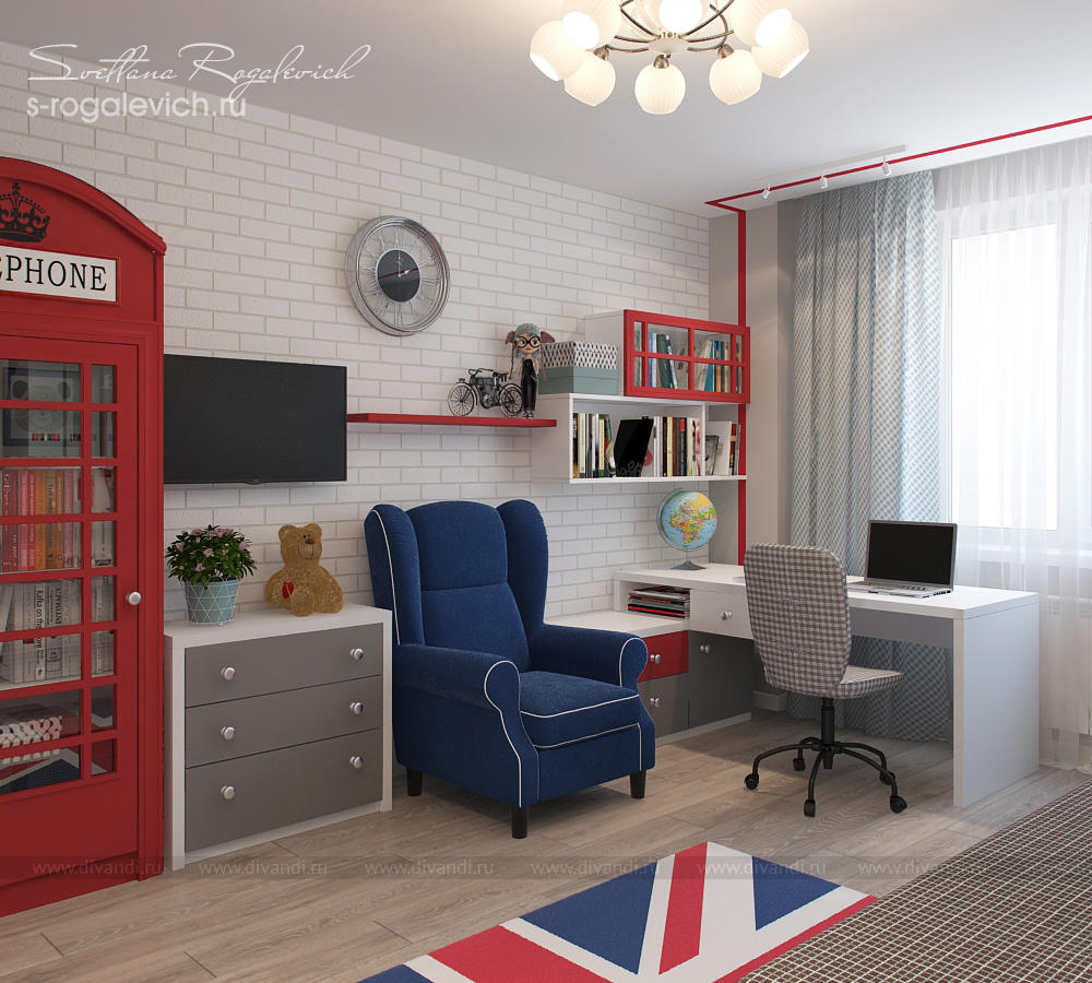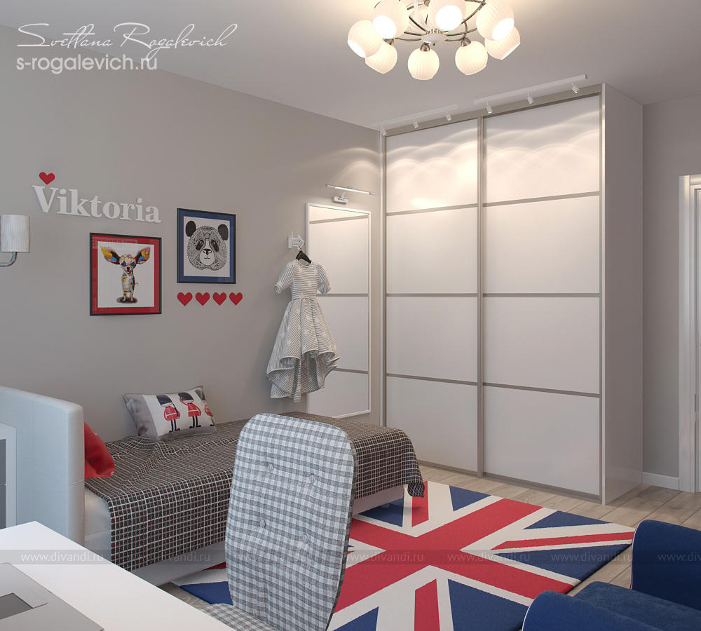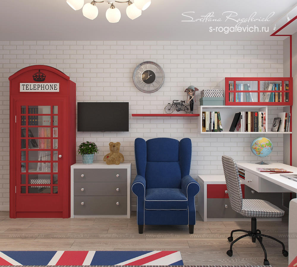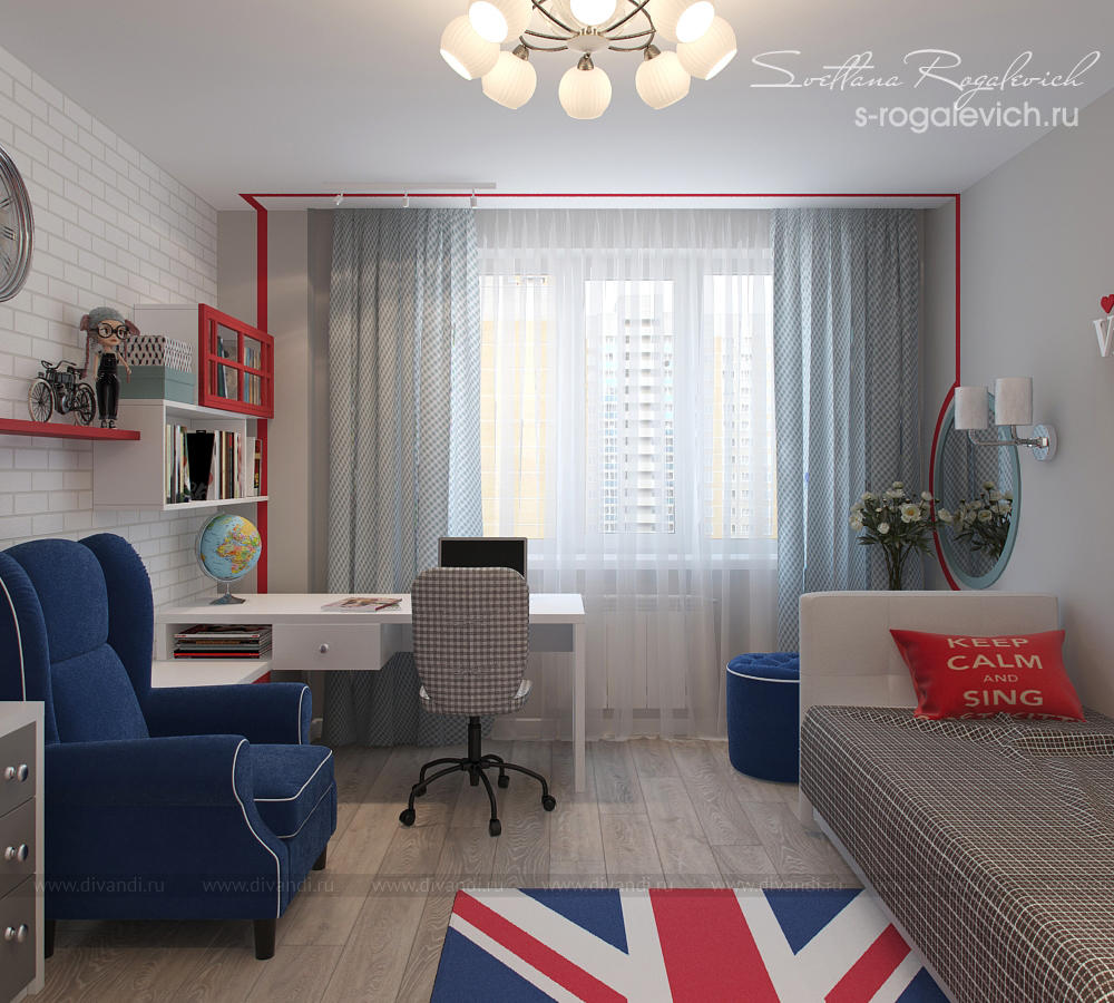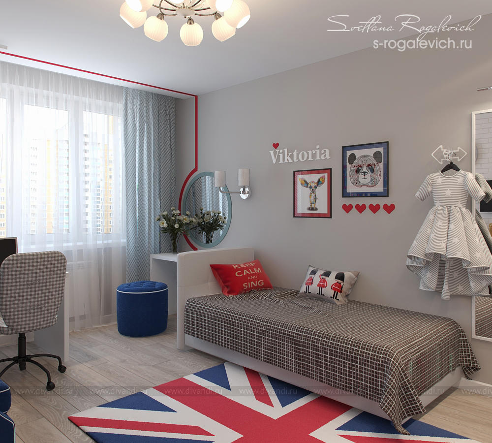 Отправной точкой в дизайне послужил ковер с изображением флага Великобритании, который заказчики приобрели в комнату своей десятилетней дочери.