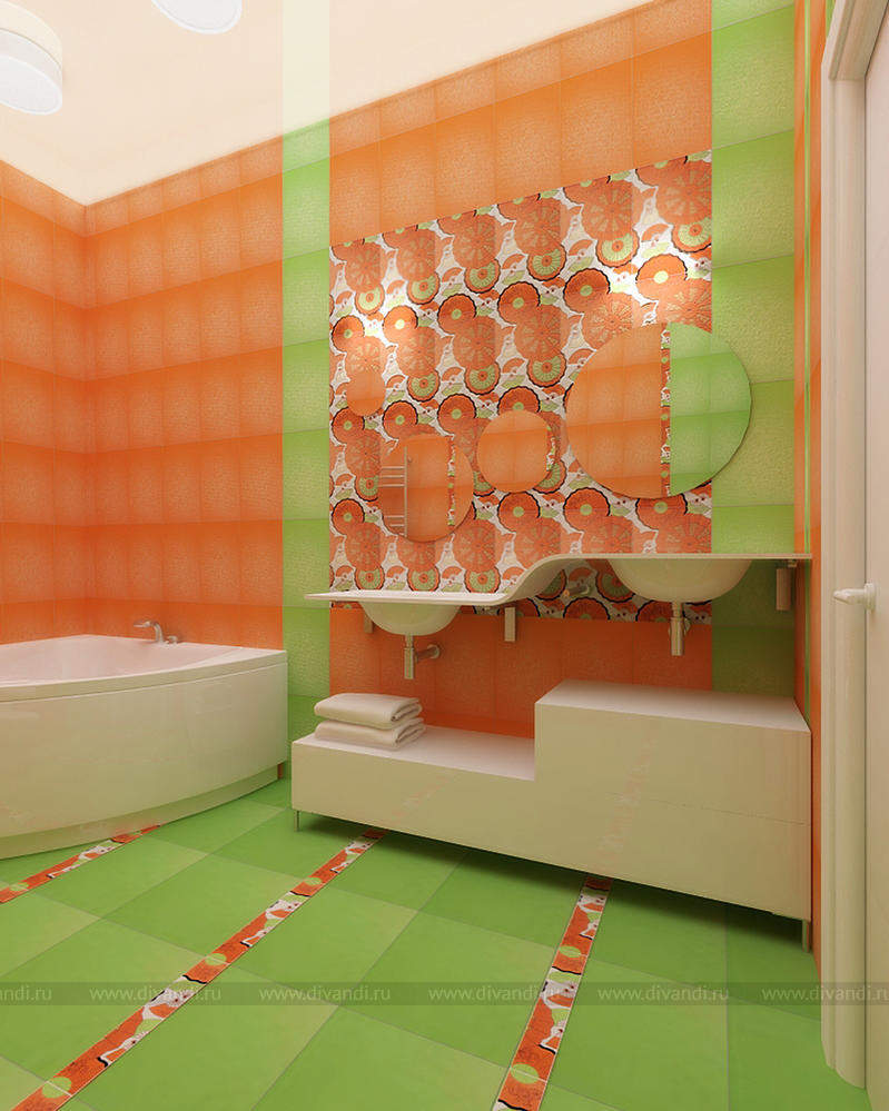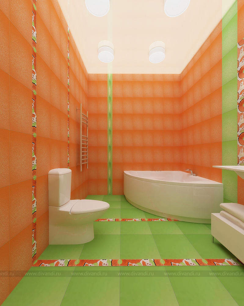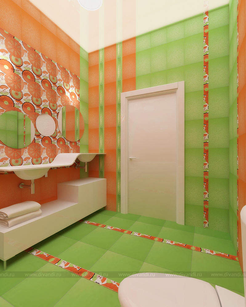 Детский санузел решен ярко, в цветовой гамме, которая может подойти как мальчику, так и девочке, потому что в данном случае дети были как раз мальчик и девочка.