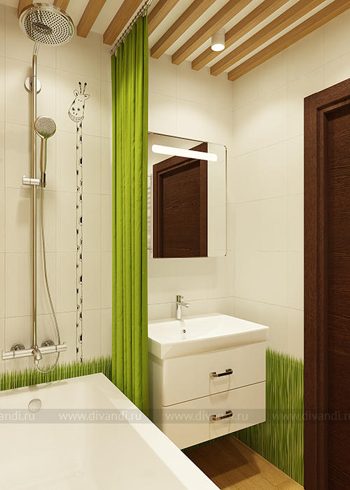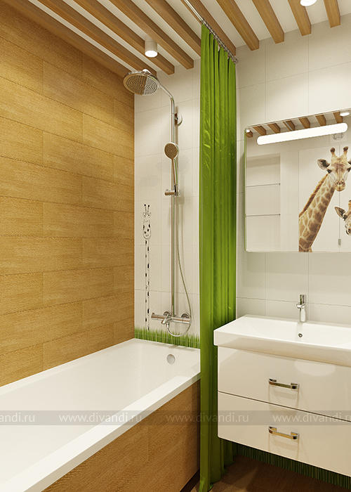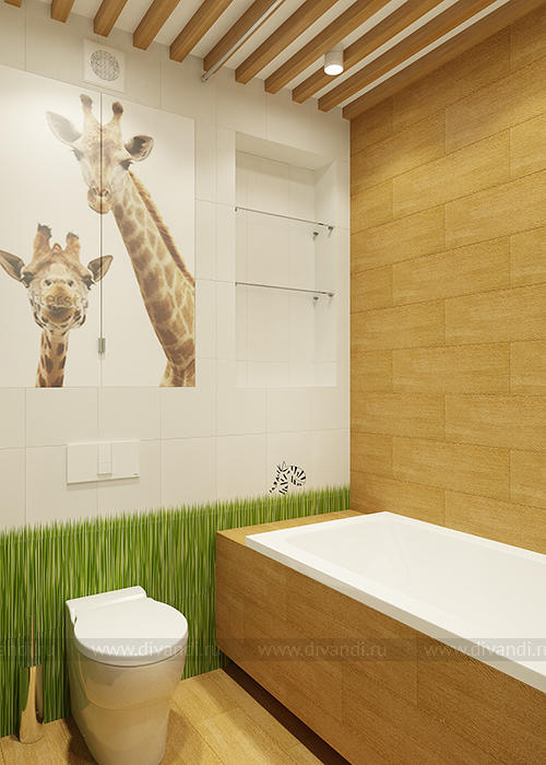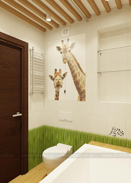 Небольшой санузел для двух замечательных малышей в эко стиле! За дверками с фото печатью с Жирафами прячется водонагреватель! Плитка так же повторяет тему Жирафов. Плитка- Steuler Louis Ella.