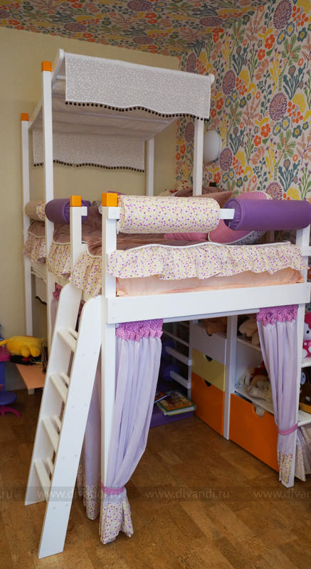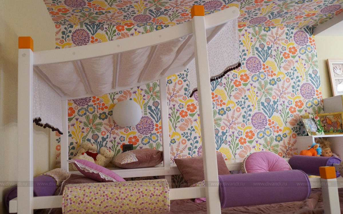 В детской для девочки, разместив кроватку на втором ярусе, удалось спланировать зону для игр, пальчикового театра, место для хранения игрушек! У окна я расположила столик для лепки и рисования, в дальнейшем на его месте будет установлен школьный письменный стол. В каждой зоне предусмотрена своя система освещения: бра около кровати, струна с подвесными светильниками в рабочей зоне, три разноцветных шара подвеса в зоне хранения игрушек. Получилась яркая и уютная комната для подрастающей принцессы!