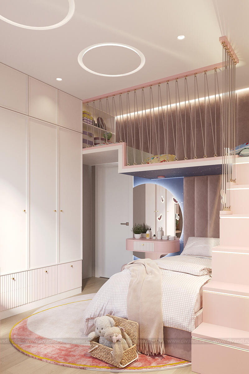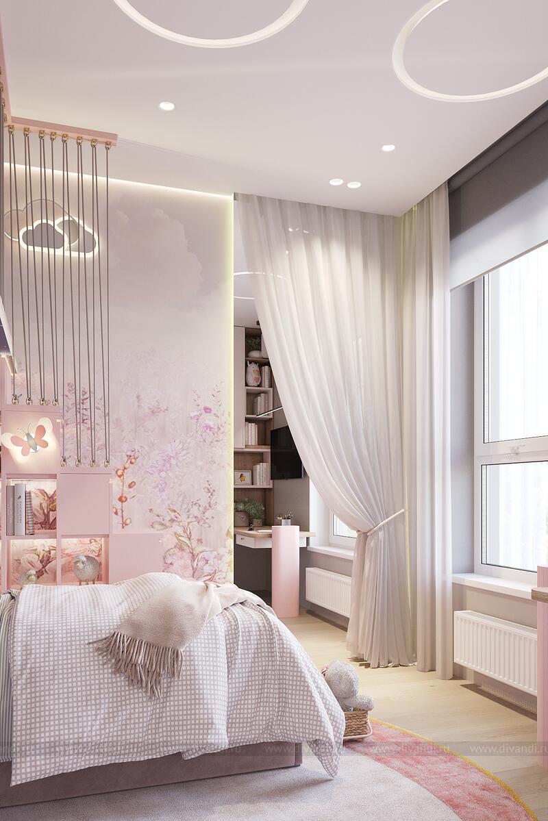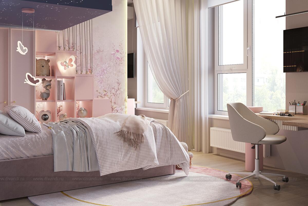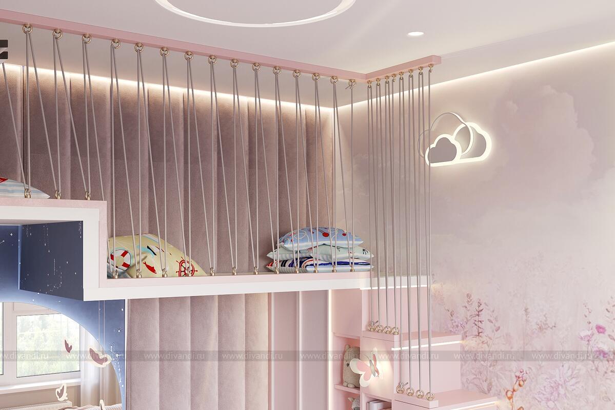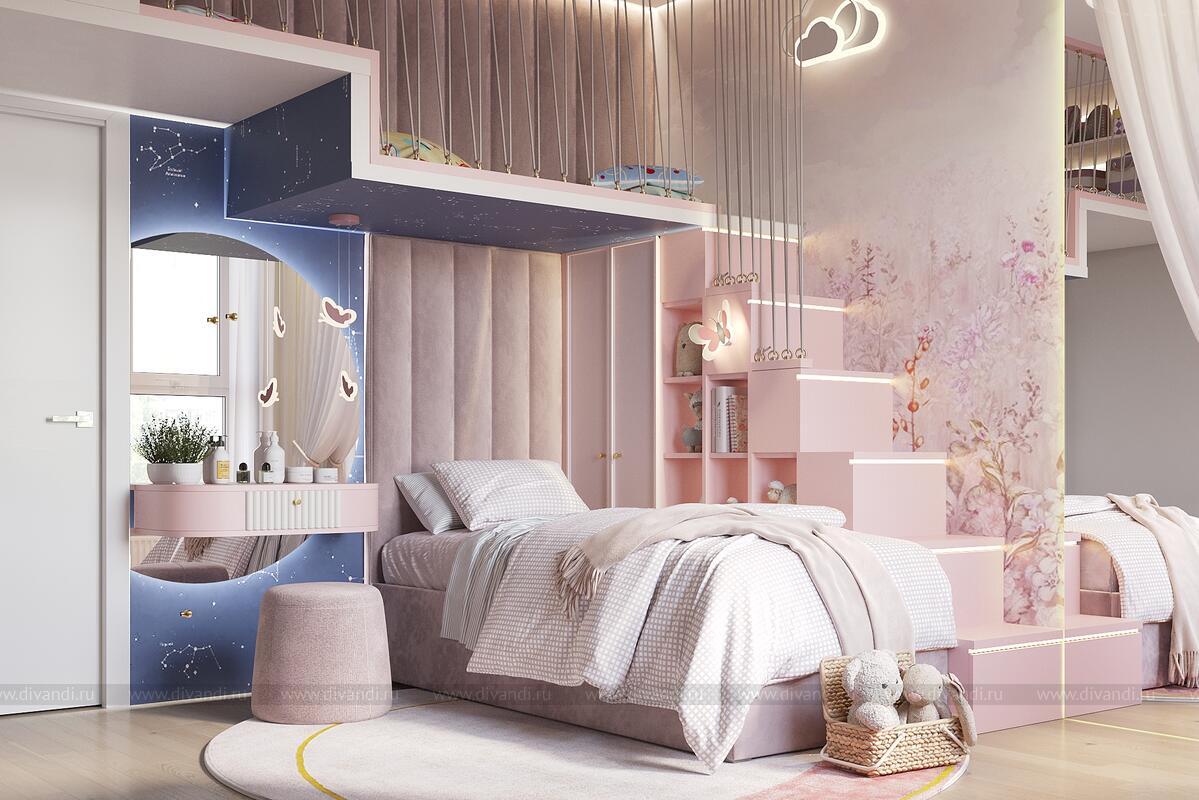Уютная и стильная детская спальня для девочки, оформленная в нежных пастельных тонах с элементами сказочного дизайна.