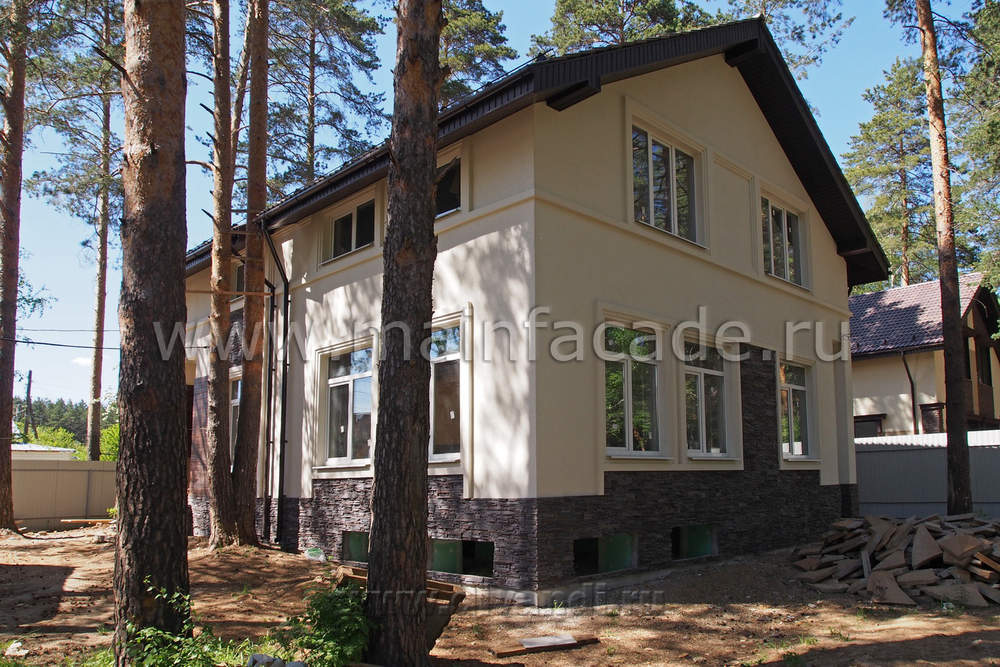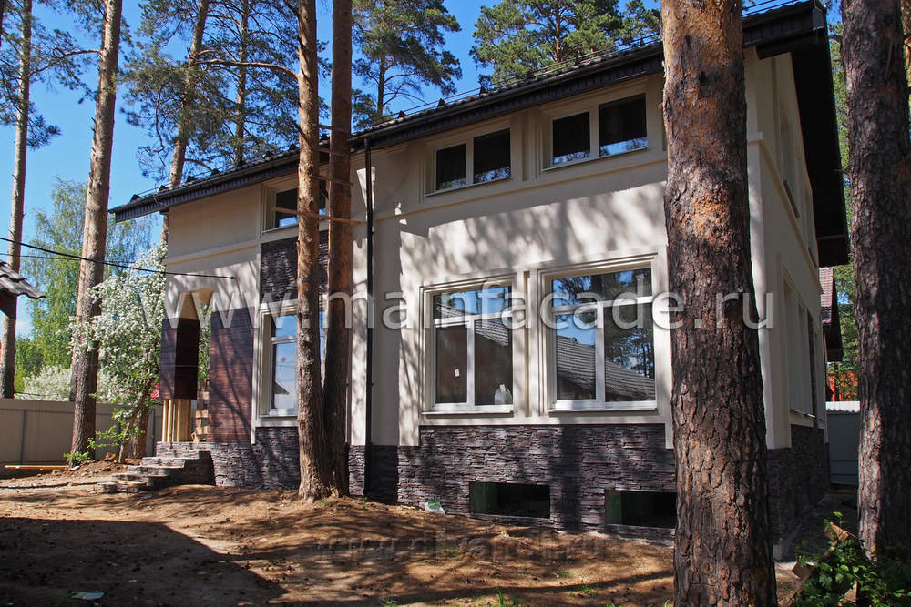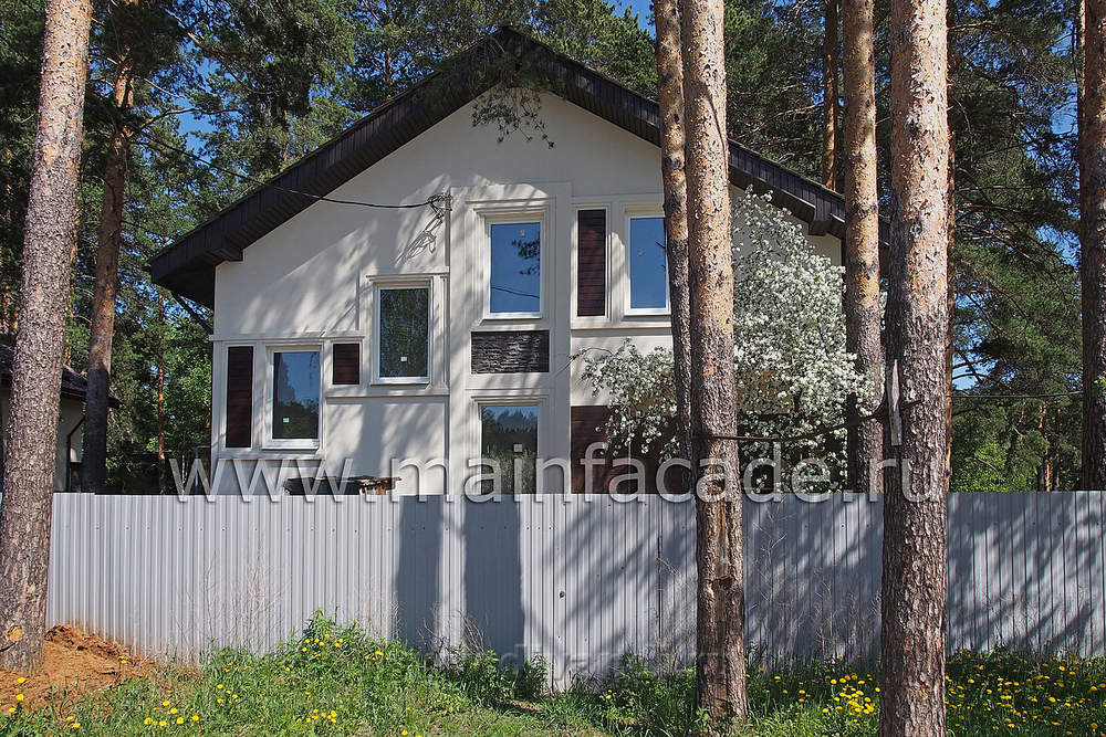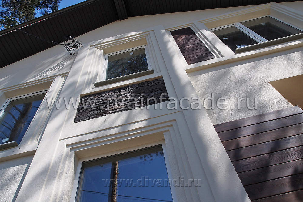 Поддержав ритм деревянными вставками и уравновесив отделкой деревом части фасада появился очень живой рисунок оконных проемов и декоративных элементов. Он прекрасно разбавил симметричный фасад традиционный формы. Общая чистота и легкость фасадного решения подчеркнута прекрасно выполненными отделочными работами.