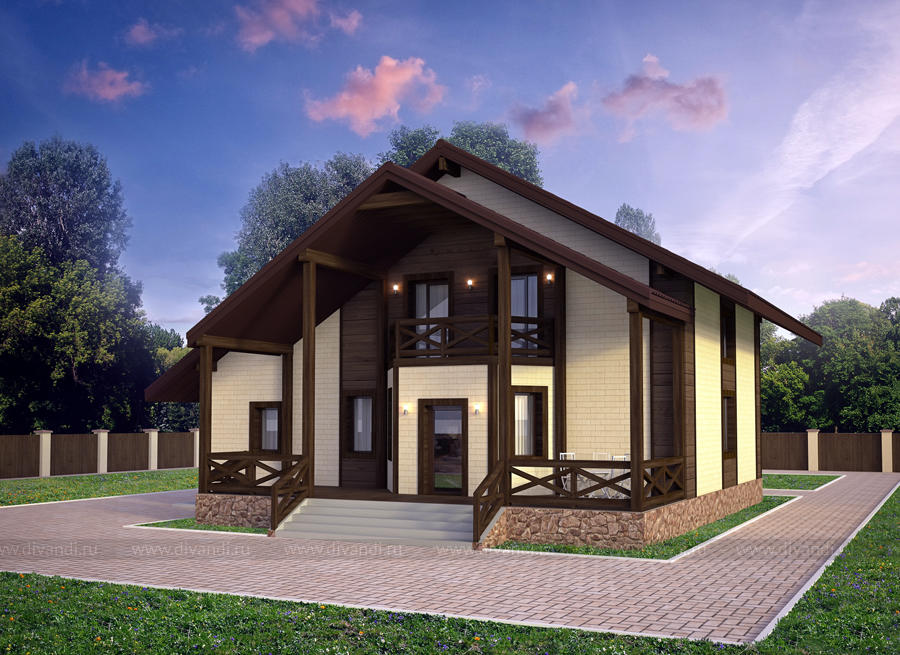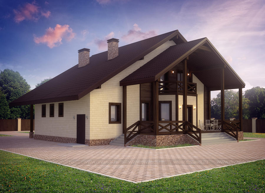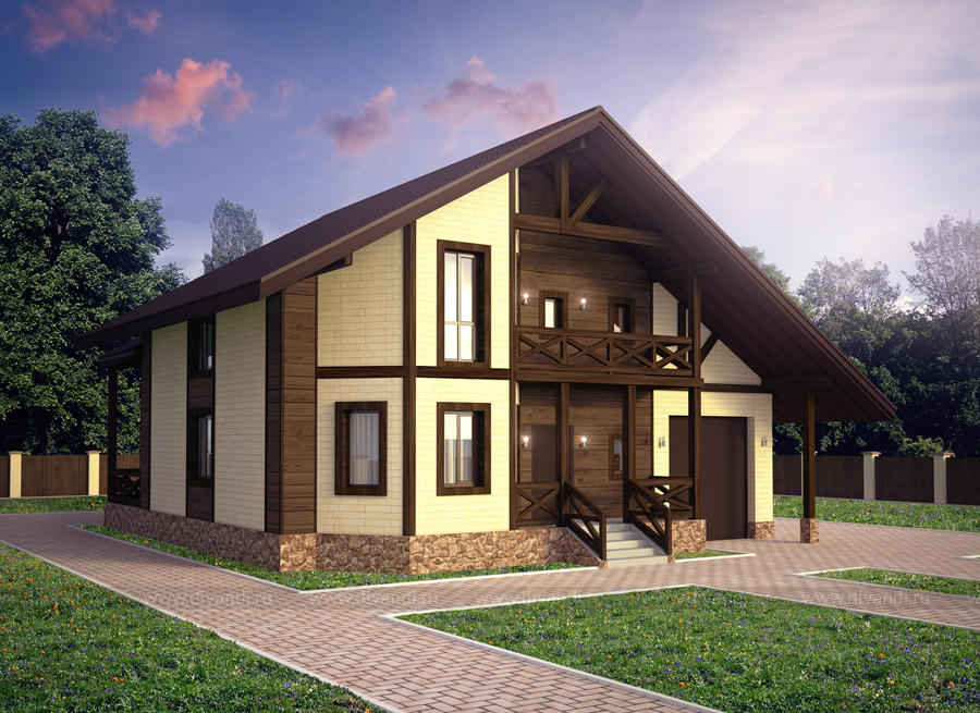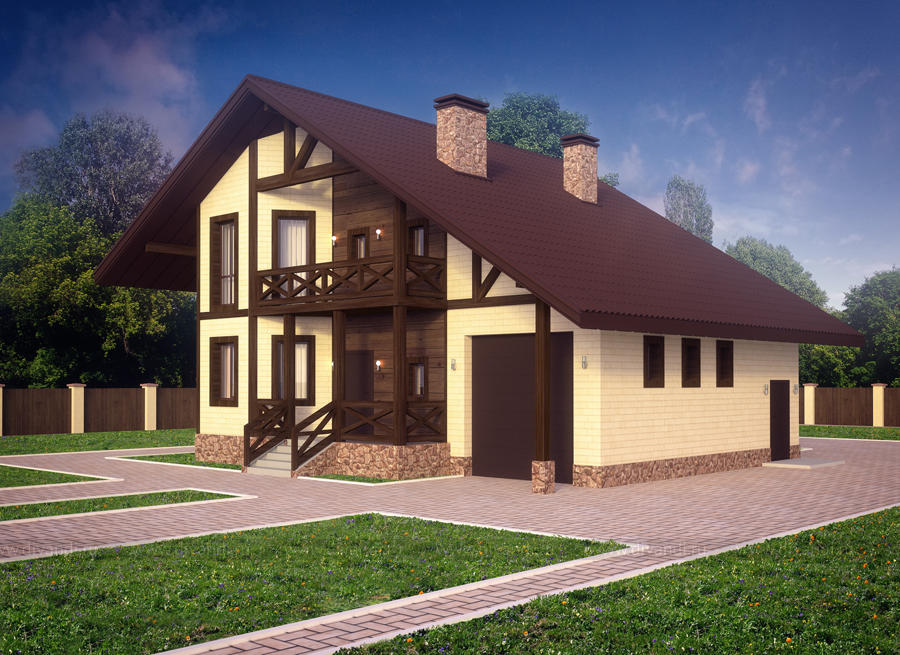 Отделка фасада загородного дома выполнена плиткой мармарок песочного цвета. Акценты и графичность дому расставляют элементы выполненные деревом.