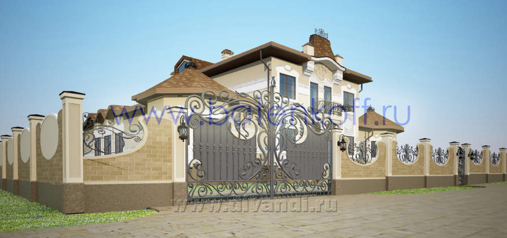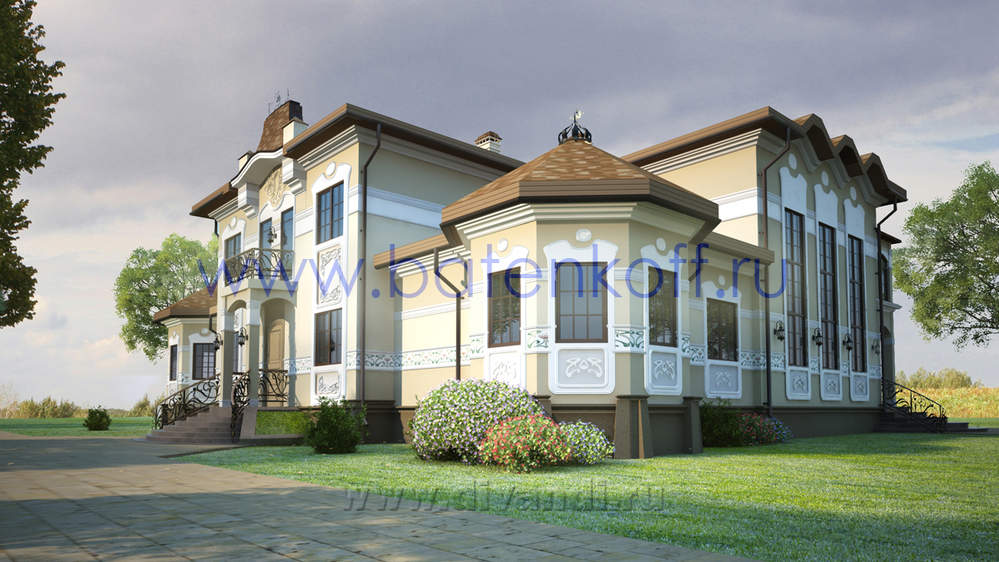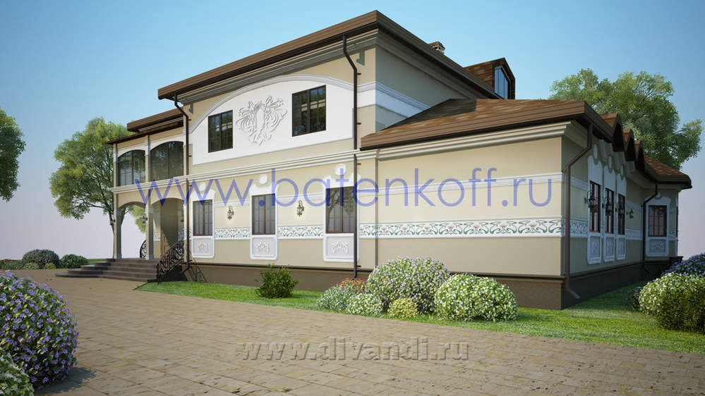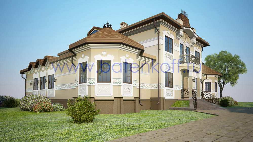 К нам обратились клиенты с просьбой обыграть фасад уже построенного дома. Дизайн фасада дома должен быть решен в стиле модерн. Мы немного видоизменили входную группу, переделали часть кровли и облицевали фасад гипсовыми элементами объединив верхнее и нижнее окно в общую рамку. На фасаде использовали несколько видов штукатурки, роспись и гипсовые орнаменты в дизайне стиля модерн. Вот такой необычный фасад получился у нас.
