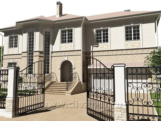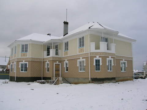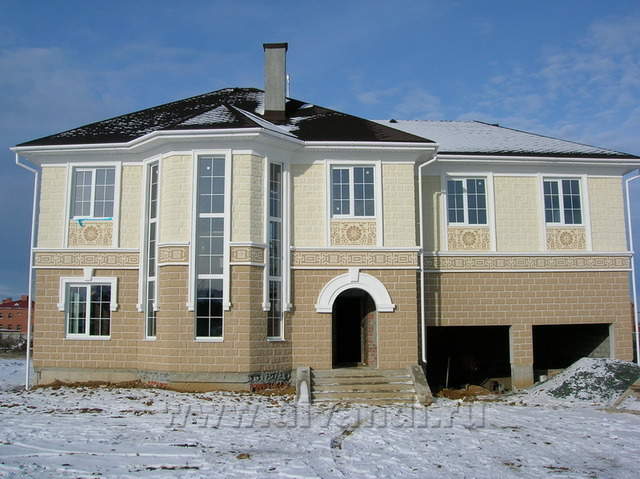 Проект Отделки фасадов коттеджа под "классику" в черте г. Екатеринбурга. Мы включились в проект на этапе возведенной коробки здания. Выполненнные из неокрашенных теплоблоков стены, представляли собой достаточно мрачное зрелище. Наш проект предусматривал окраску стен, швов; введение декоративных поясков и обналички из пенополиуретана, а также "изюминку" - нанесение росписи на фасад в определенных местах. Также были подобраны окна с нужной разрезкой и разработан рисунок кованых элементов - ограждений и декора. Срок выполнения проекта 2,5 недели.