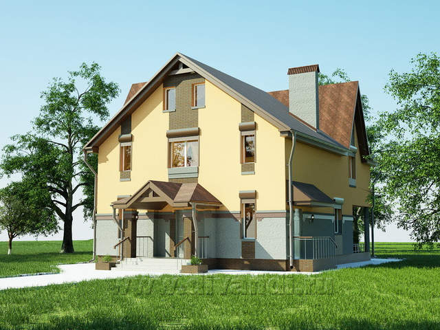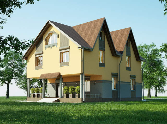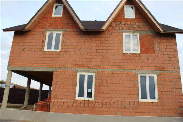 Фасад - штукатурка двух типов с использованием клинкерной плитки; декор - пенополиуретановый.