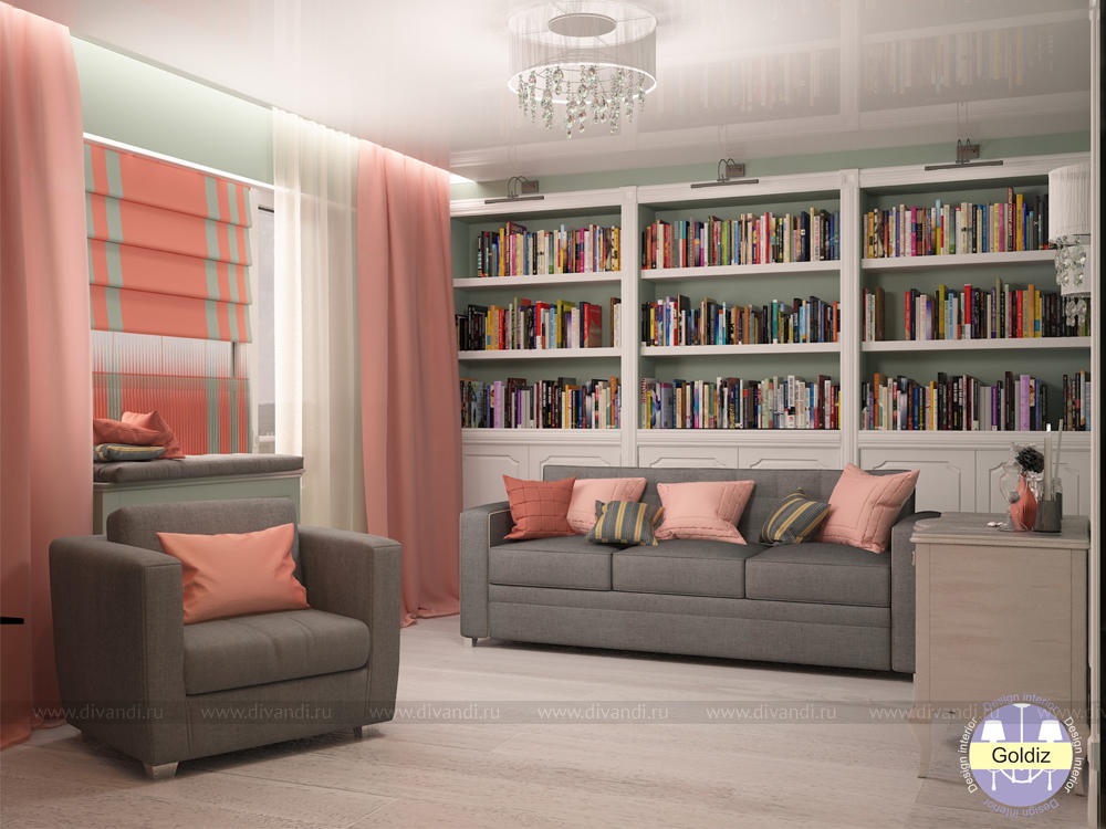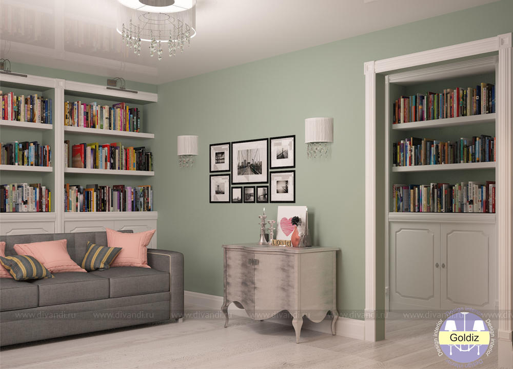 Дизайн гостиной с росписью стены в виде классического орнамента