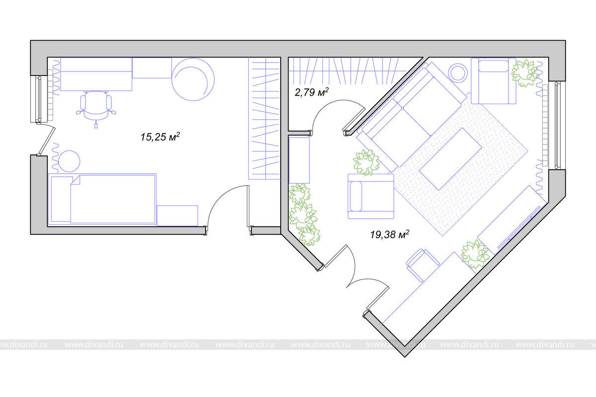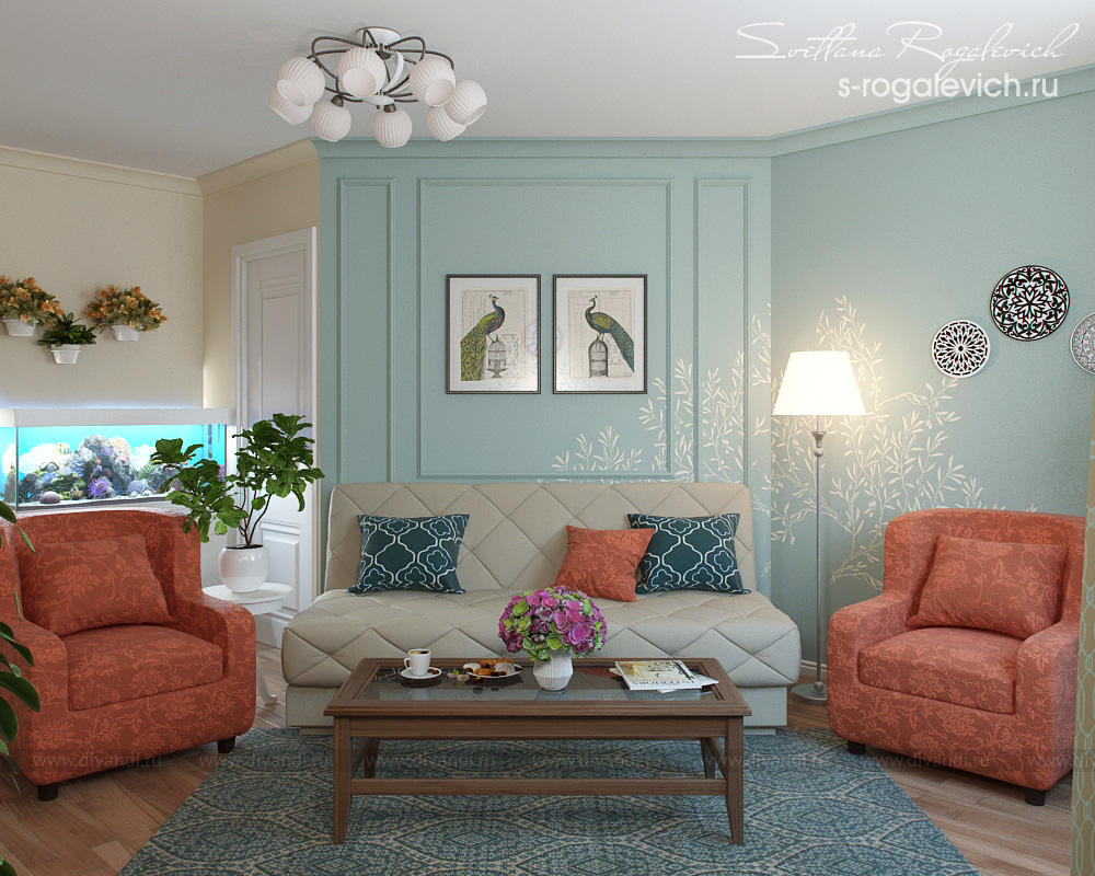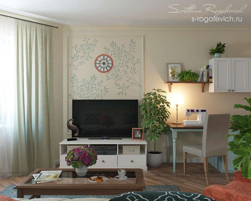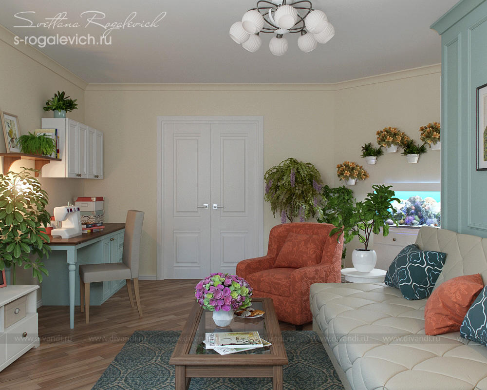 Дизайн комнат разработан для семьи из 2-х человек - молодой женщины и ее 15-летнего сына. Перепланировка пятиугольной гостиной, которая выполняет еще и роль спальни заказчицы, позволила выделить место для гардеробной, а также удобно организовать зону отдыха. В проекте учтены увлечения клиентки - шитье, разведение домашних растений и рыбок.