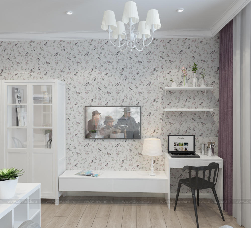 Дизайн интерьера гостиной сдержан, уютен и в тоже время очень мил своими деталями и акцентами. Цветовая палитра спокойная - серый, пепельно- розовый, сиреневый, теплый цвет натурального дерева и белый. Небольшое пространство получилось разделить на зоны, и в тоже время сложить в гармоничное общее пространство.