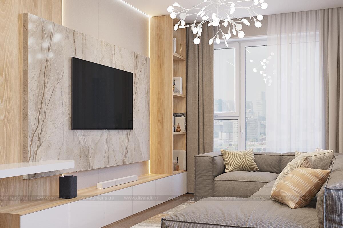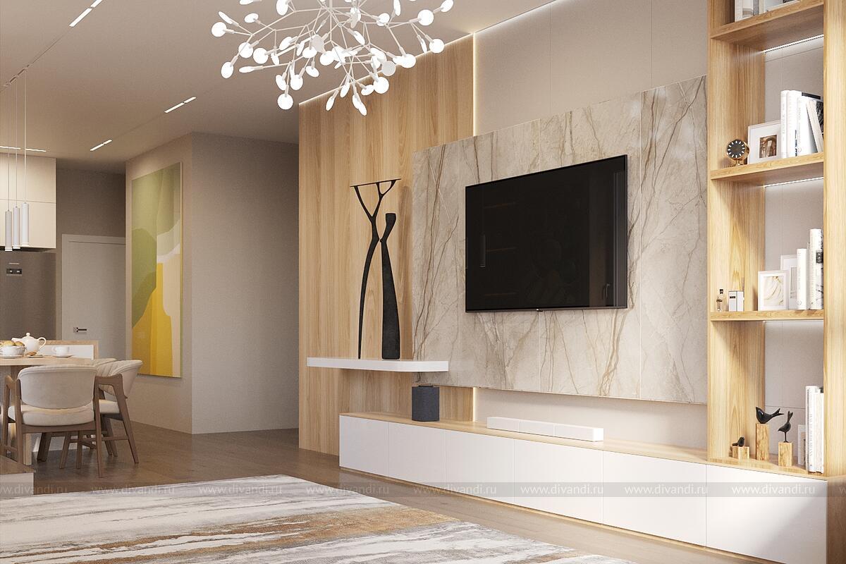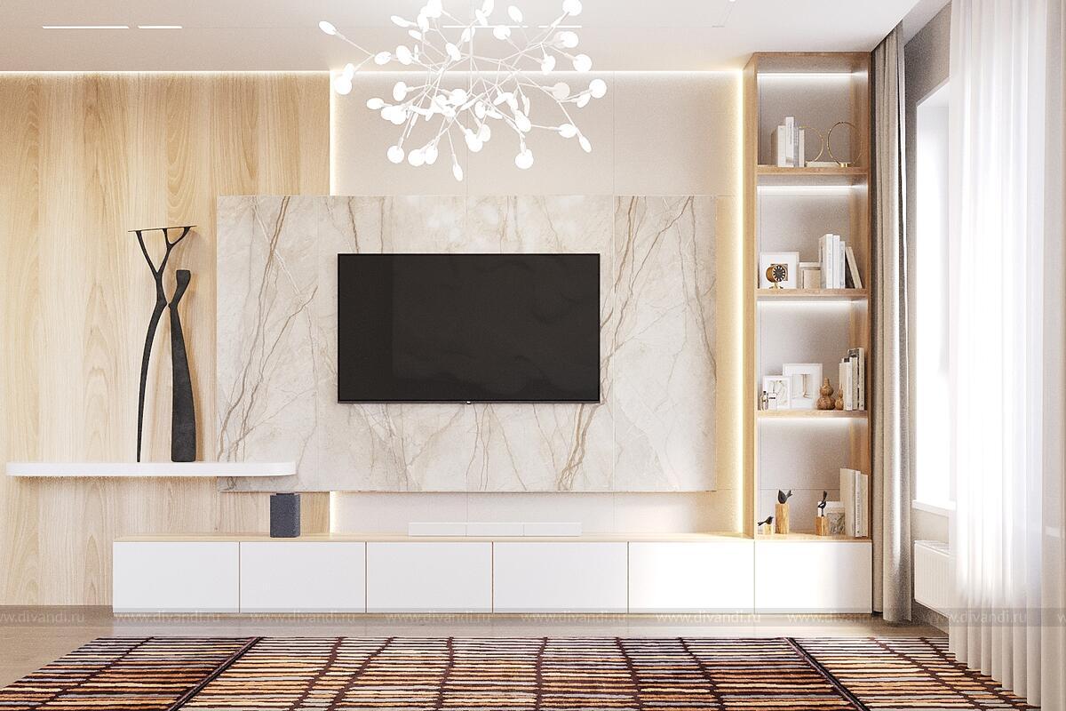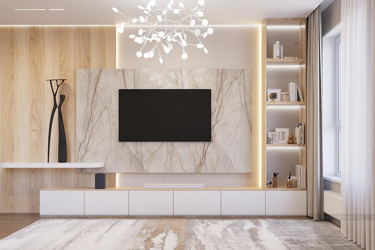 ТВ-зона в гостиной, оформленная в современном стиле с элементами минимализма. Вот ключевые особенности дизайна: