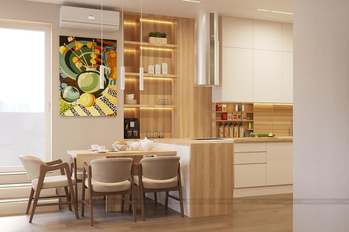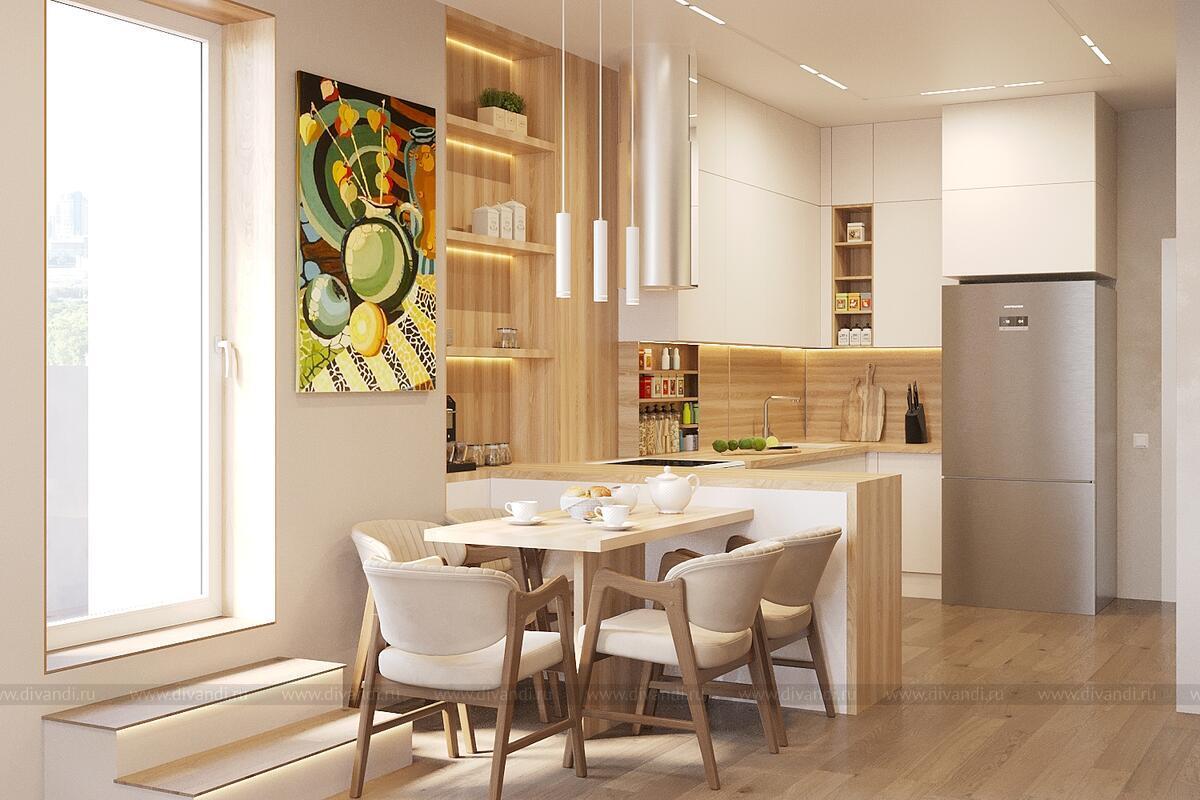 сочетание белого и светлого дерева визуально облегчает конструкцию.