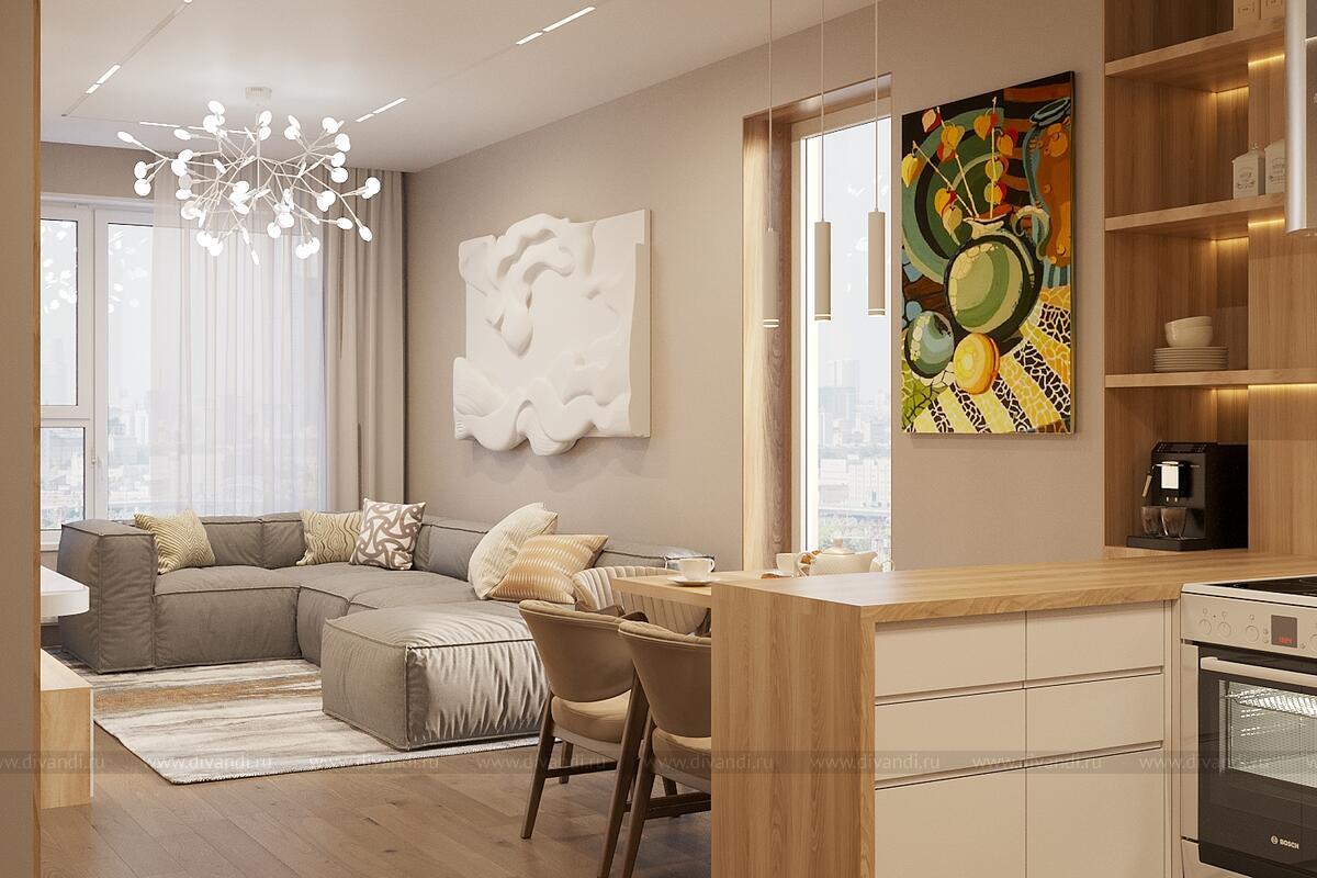 ковёр с абстрактным рисунком в бежево-серых тонах объединяет пространство и добавляет уюта.