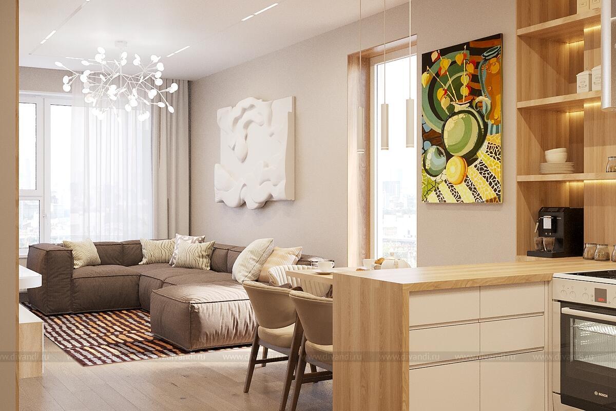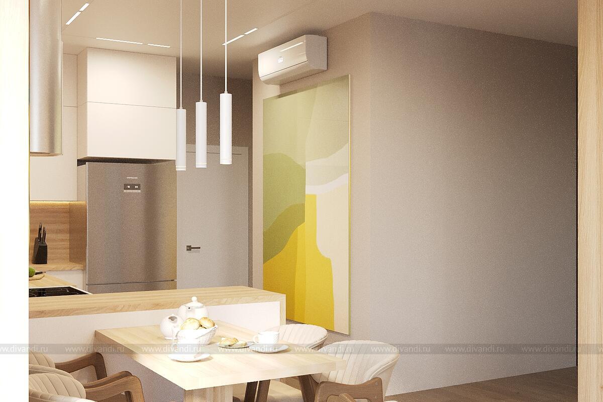 на заднем плане видна обеденная зона с лаконичным столом и светлыми стульями — интерьер выполнен в едином стиле;