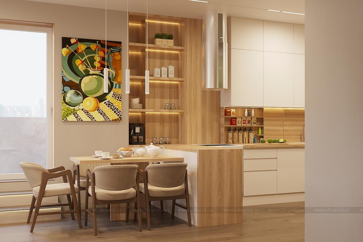 сочетание деревянных панелей и гладких поверхностей добавляет глубину и фактурность.