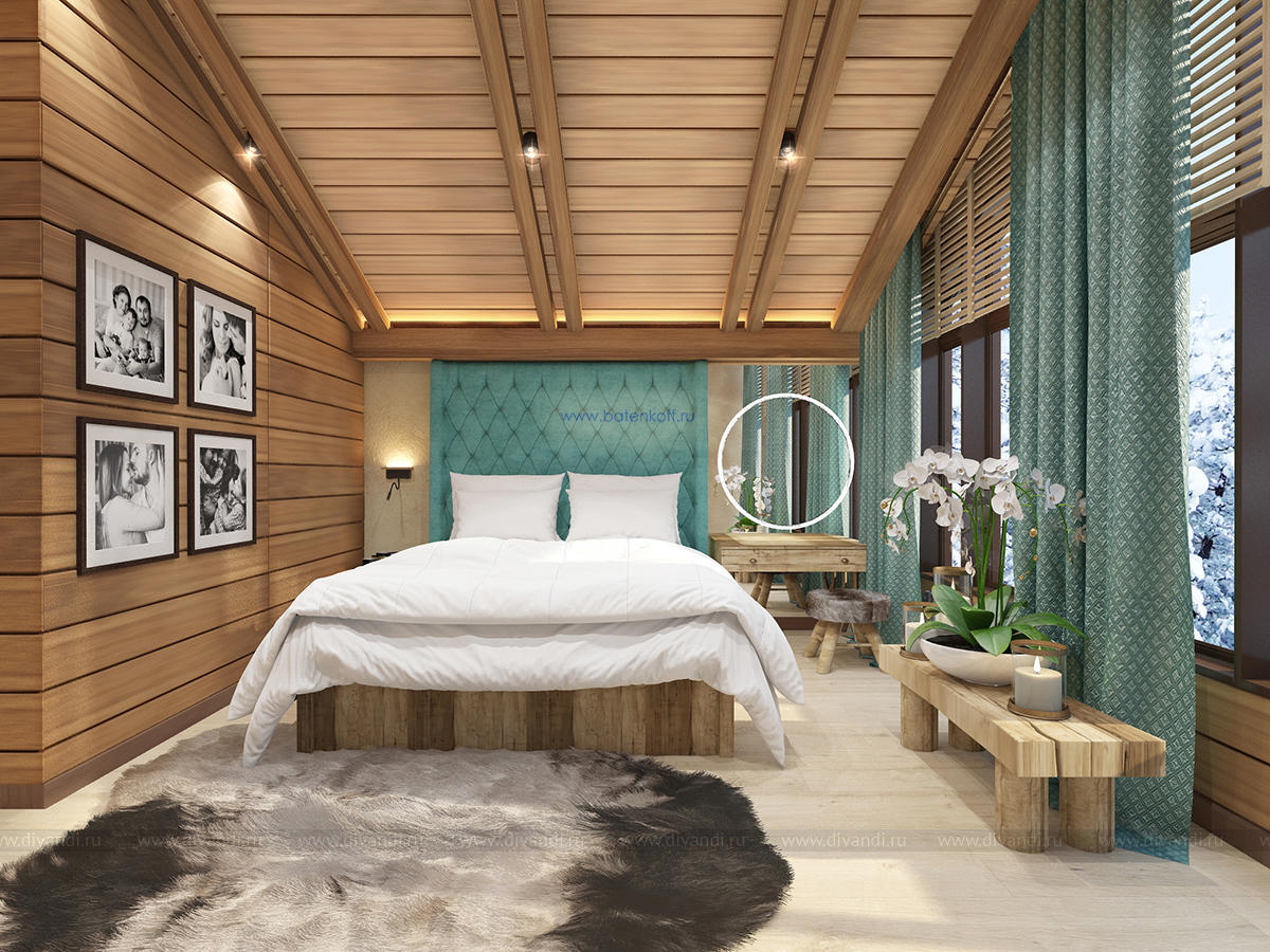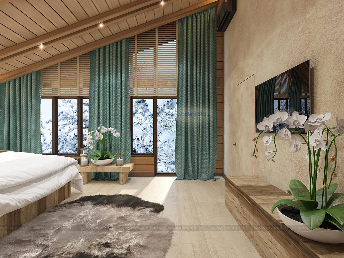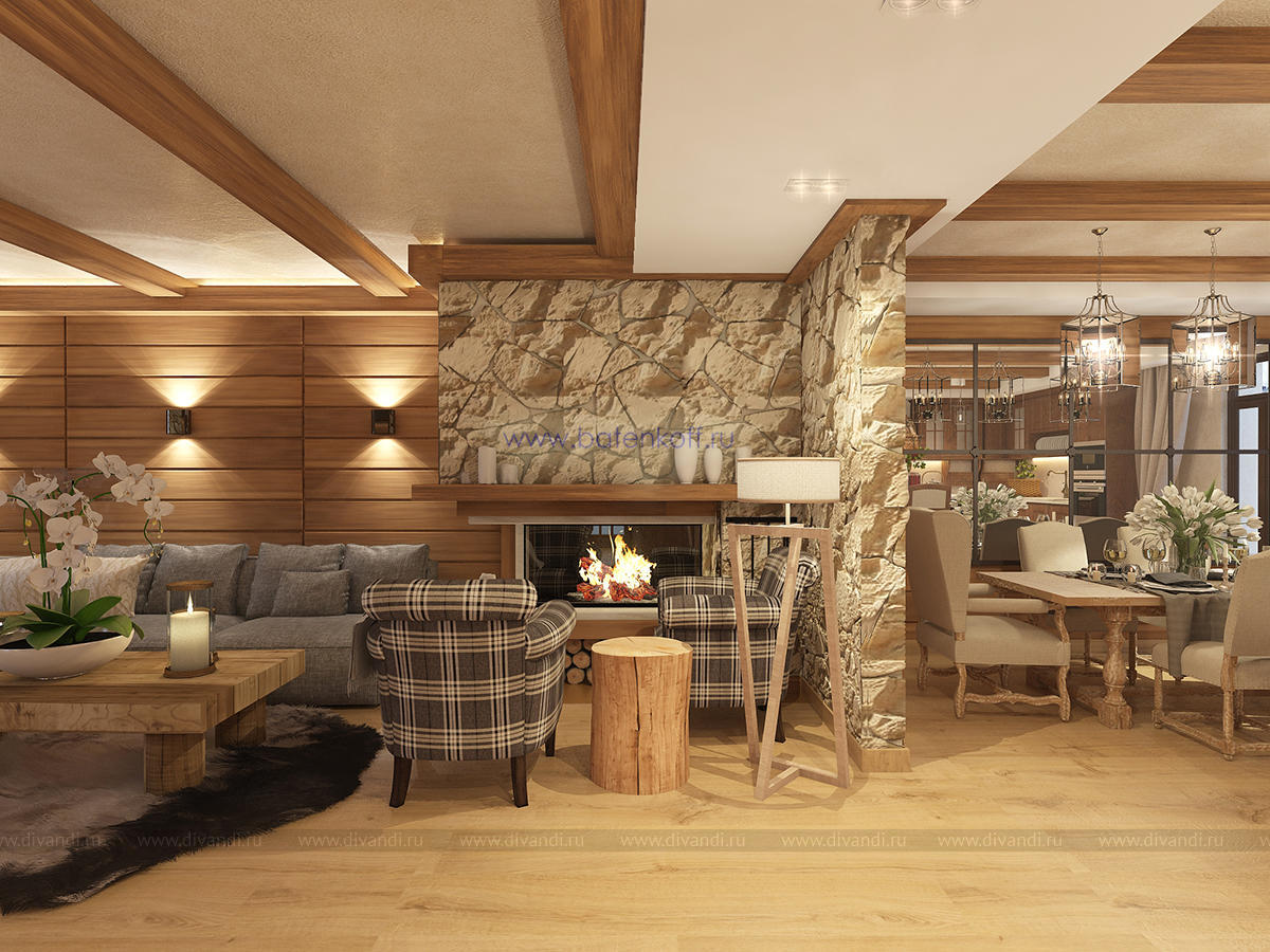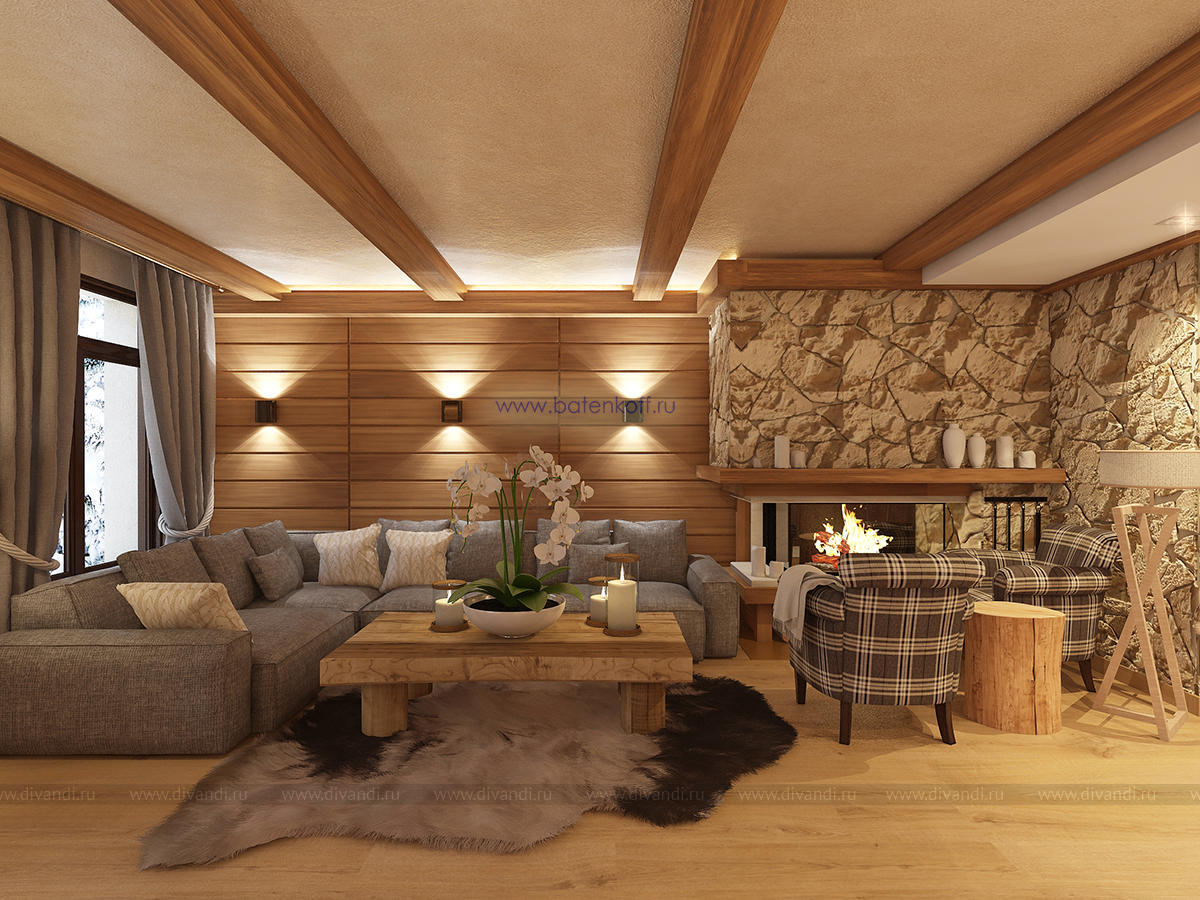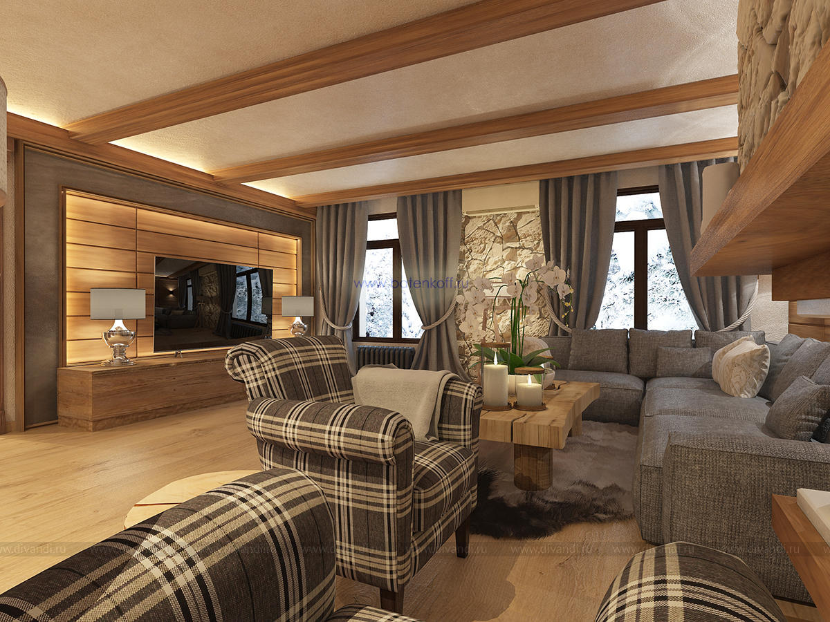 Альпийский стиль требует преимущественно натуральных материалов, что сказывается на ценовом аспекте. Но результат того стоит. Только потолок, оформленный обычно темными, неотбеленными балками поражает воображение. Продолжением являются деревянные стеновые панели, бруски, имитирующие подпорки, придающие своеобразную атмосферу всему помещению. Стены могут оформляться серым камнем, делающим комнату более изысканной. На фоне дерева отлично смотрятся оштукатуренные поверхности, преимущественно светлых оттенков. Применимы комбинации разных пород дерева: дуб, сосна, лиственница. Особый рустикальный шарм дают напольные покрытия с имитацией старения: массив доски должен остаться после обработки матовым, полуматовым. Необходимые зоны (кухня, ванная) отделывается плиткой, причем тоже из особых, «деревенских» коллекций.Современные представления изменили внешний вид окон стиля шале. Они стали гораздо больше, чаще панорамные, но неизменными остались другие аспекты.Финальный результат будет непосредственно зависеть от декорирования окон. Предпочтительнее лёгкие, натуральные материалы: лён, хлопок. Расцветка спокойная, принты максимально простые (светлая клетка) или с узнаваемыми альпийскими мотивами.