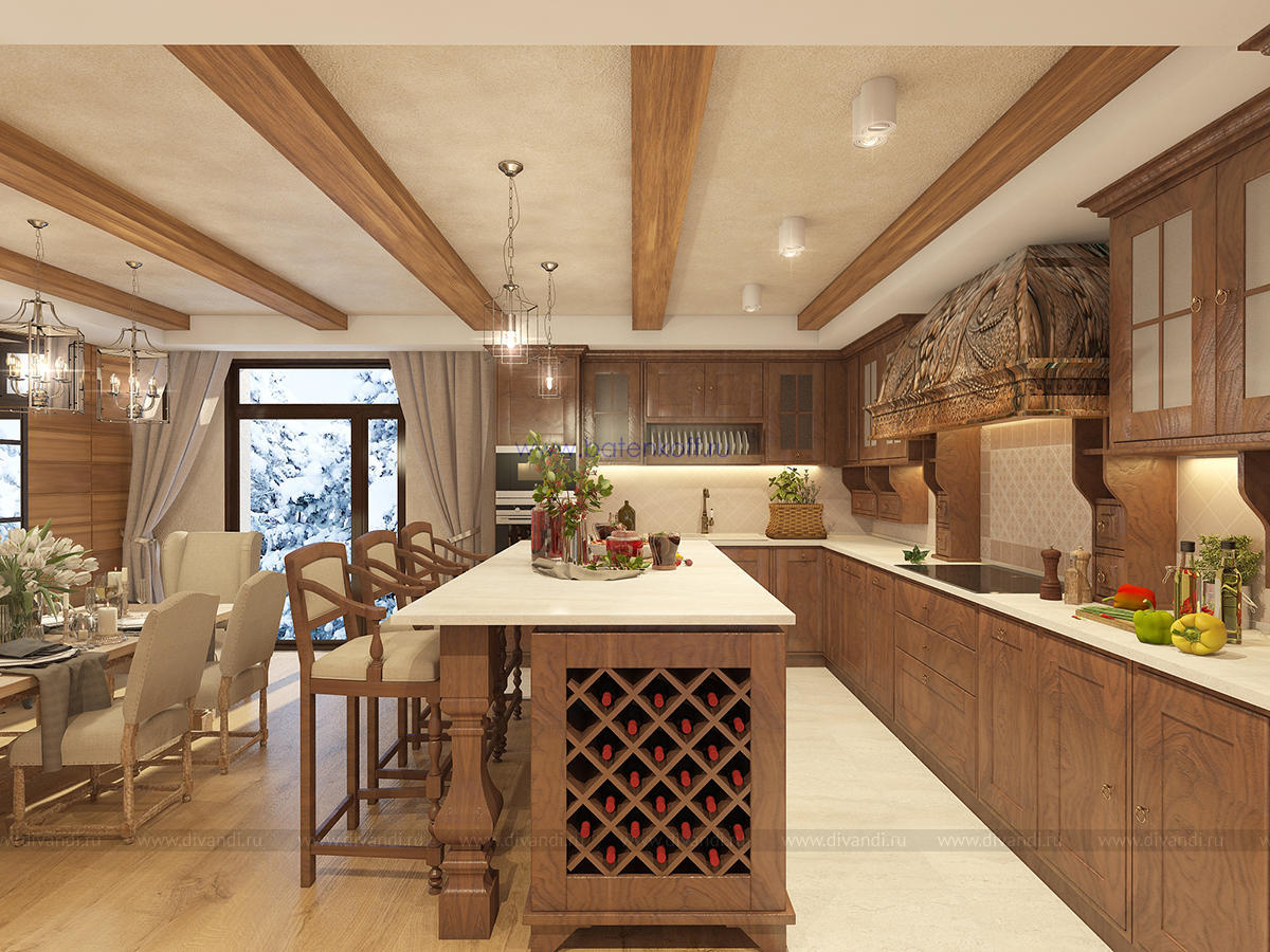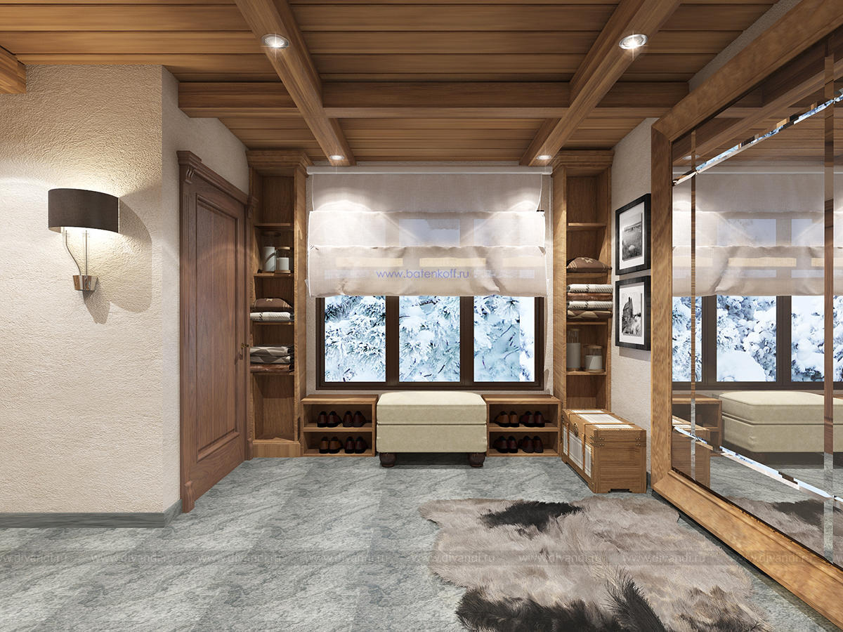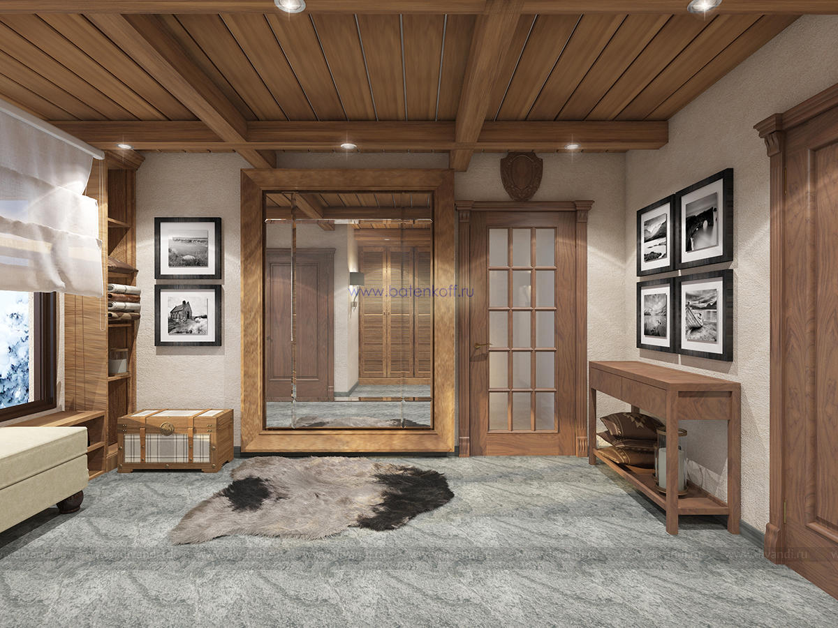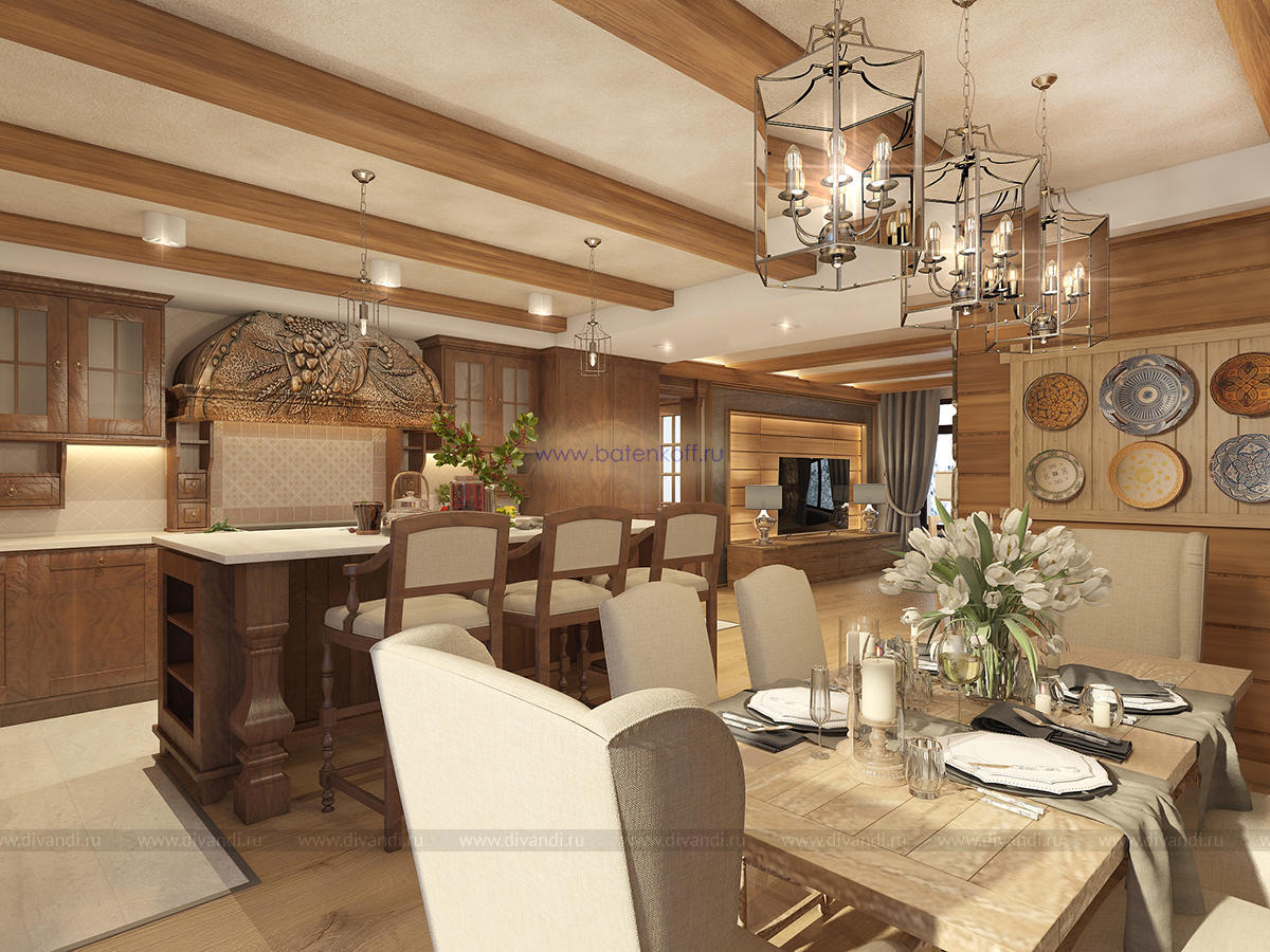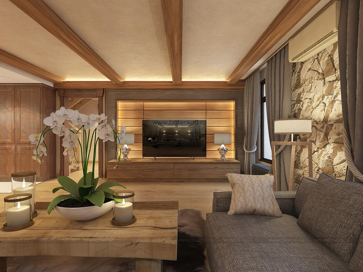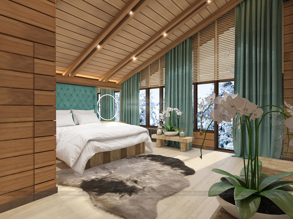 Альпийский стиль требует преимущественно натуральных материалов, что сказывается на ценовом аспекте. Но результат того стоит. Только потолок, оформленный обычно темными, неотбеленными балками поражает воображение. Продолжением являются деревянные стеновые панели, бруски, имитирующие подпорки, придающие своеобразную атмосферу всему помещению. Стены могут оформляться серым камнем, делающим комнату более изысканной. На фоне дерева отлично смотрятся оштукатуренные поверхности, преимущественно светлых оттенков. Применимы комбинации разных пород дерева: дуб, сосна, лиственница. Особый рустикальный шарм дают напольные покрытия с имитацией старения: массив доски должен остаться после обработки матовым, полуматовым. Необходимые зоны (кухня, ванная) отделывается плиткой, причем тоже из особых, «деревенских» коллекций.Современные представления изменили внешний вид окон стиля шале. Они стали гораздо больше, чаще панорамные, но неизменными остались другие аспекты.Финальный результат будет непосредственно зависеть от декорирования окон. Предпочтительнее лёгкие, натуральные материалы: лён, хлопок. Расцветка спокойная, принты максимально простые (светлая клетка) или с узнаваемыми альпийскими мотивами.