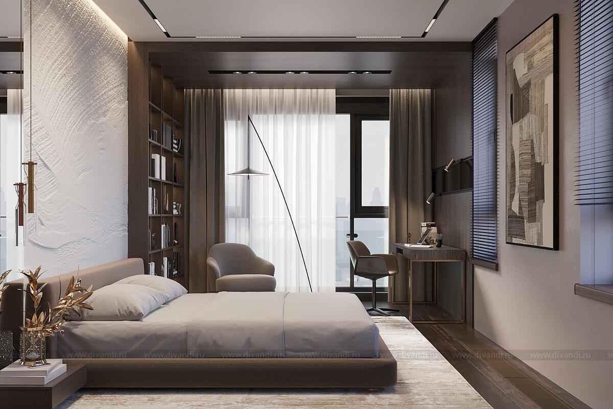 чётко выделены зоны сна (с кроватью в центре), отдыха (с креслом у окна) и работы (с письменным столом).