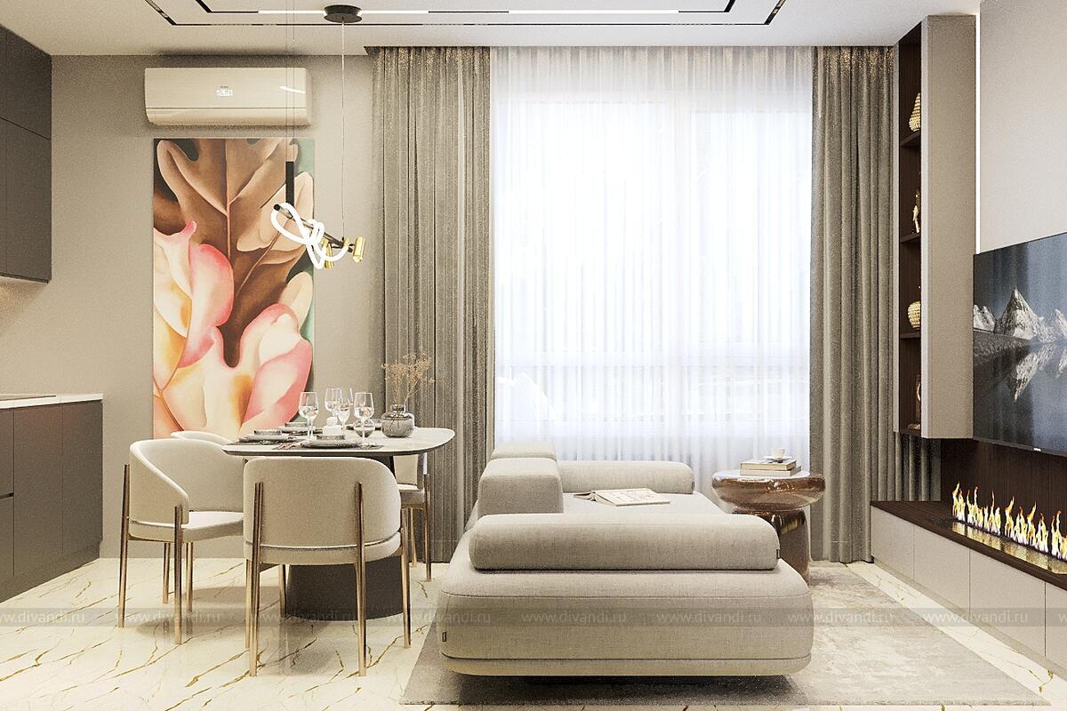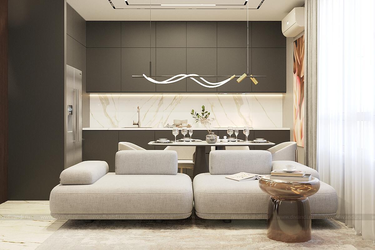 Современный интерьер совмещённой кухни-гостиной в минималистичном стиле с элементами роскоши.