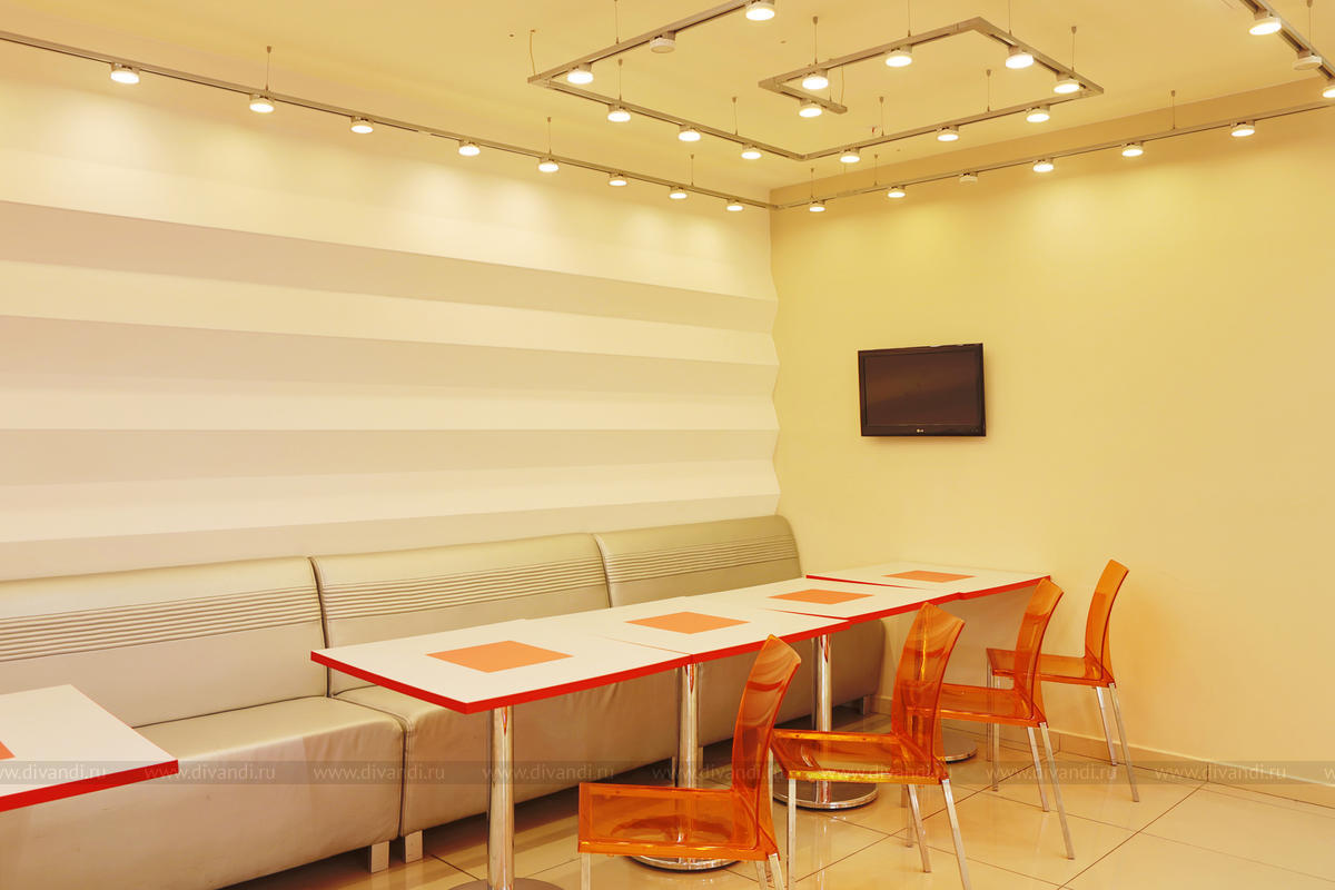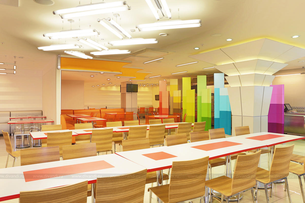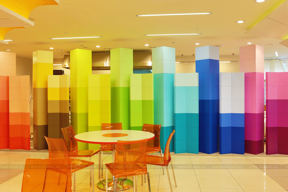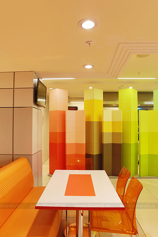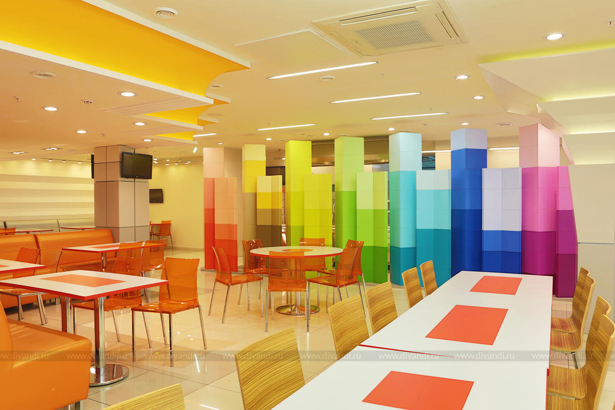 Современный яркий интерьер кафе Offline для сотрудников СКБ Контур. Реализация 2010 год.