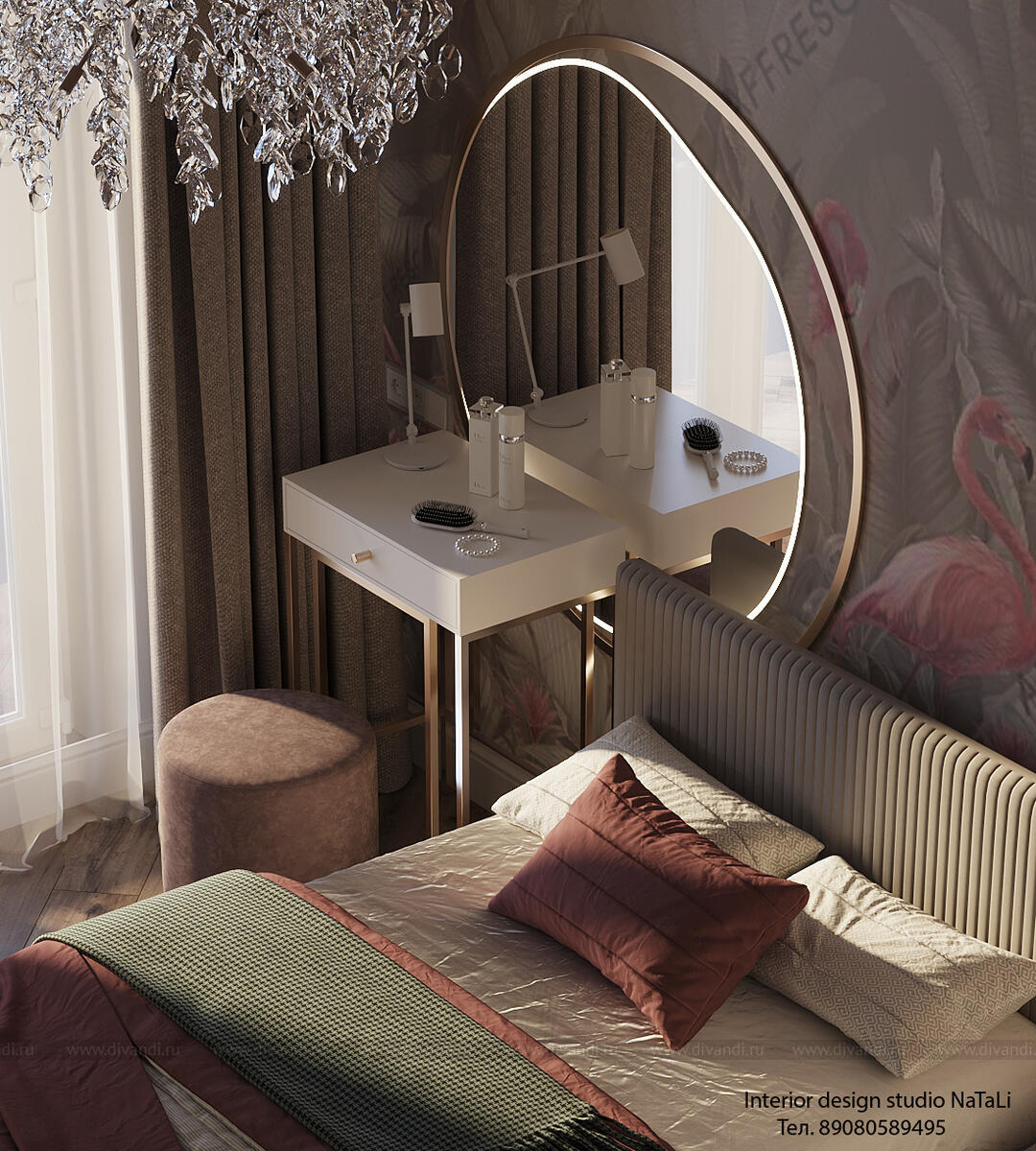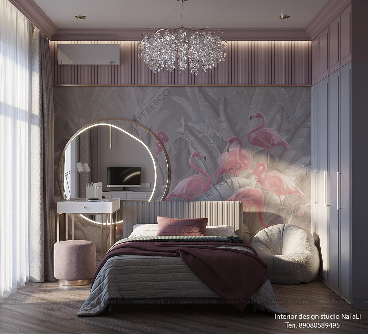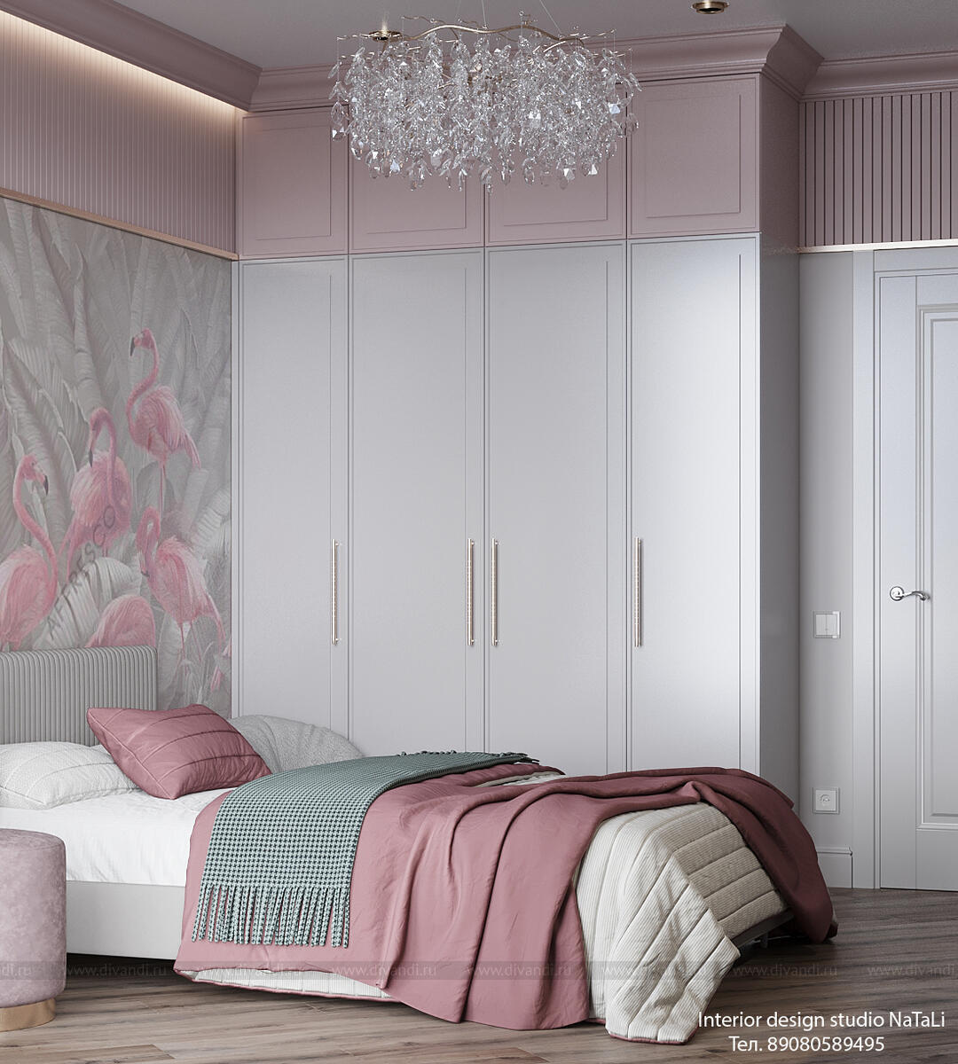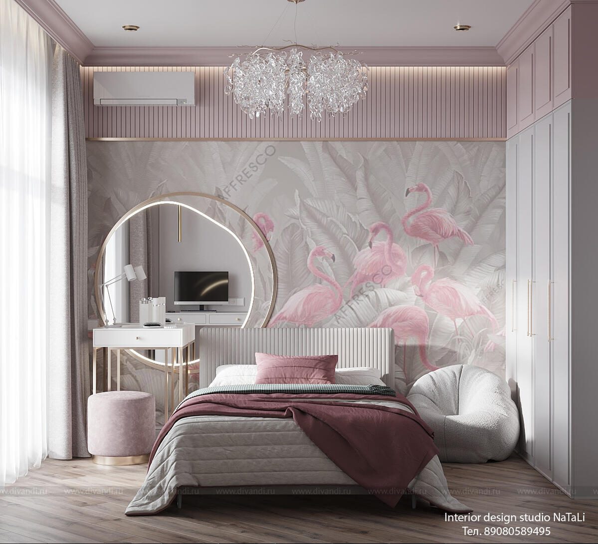 Эта комната создана с любовью и вниманием к деталям: мягкие розовые тона создают атмосферу тепла и уюта, а художественная фреска с изящными фламинго добавляет уникальный акцент, превращая стену в настоящее произведение искусства. Фламинго символизируют грацию, легкость и игривость — качества, которые так важны в детском мире.