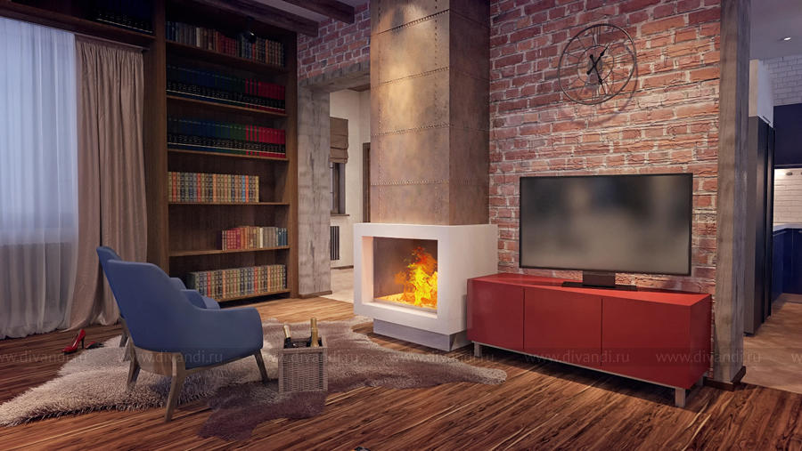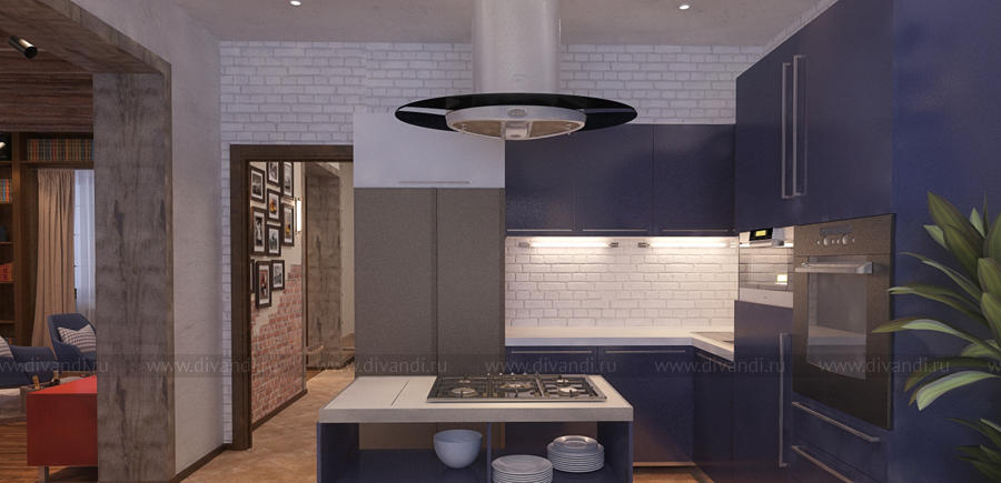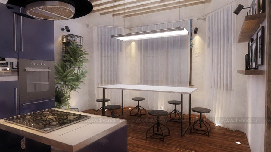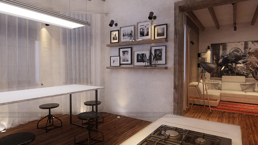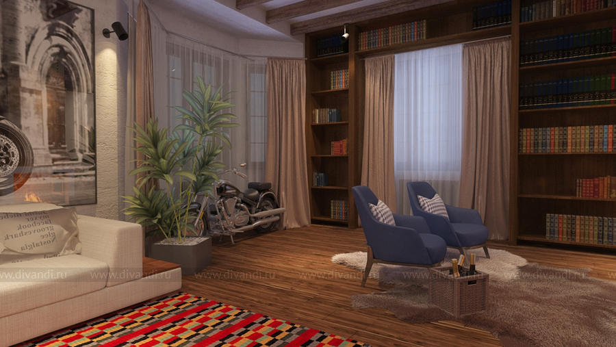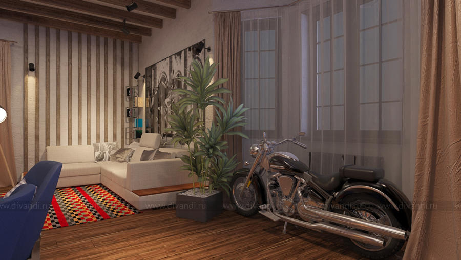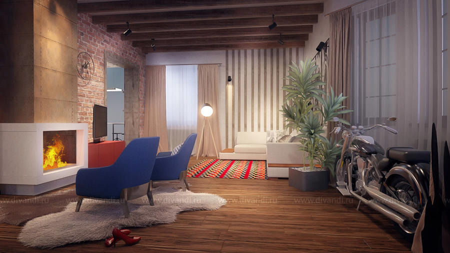 Дизайн-проект интерьера загородного коттеджа для приятных встреч дружной компанией. Общая стилистика дома – стиль лофт, акцент на увлечения хозяина – мотоспорт и мотоциклы. Используемые материалы: штукатурка с текстурой "под бетон", кирпич, металл, дерево.