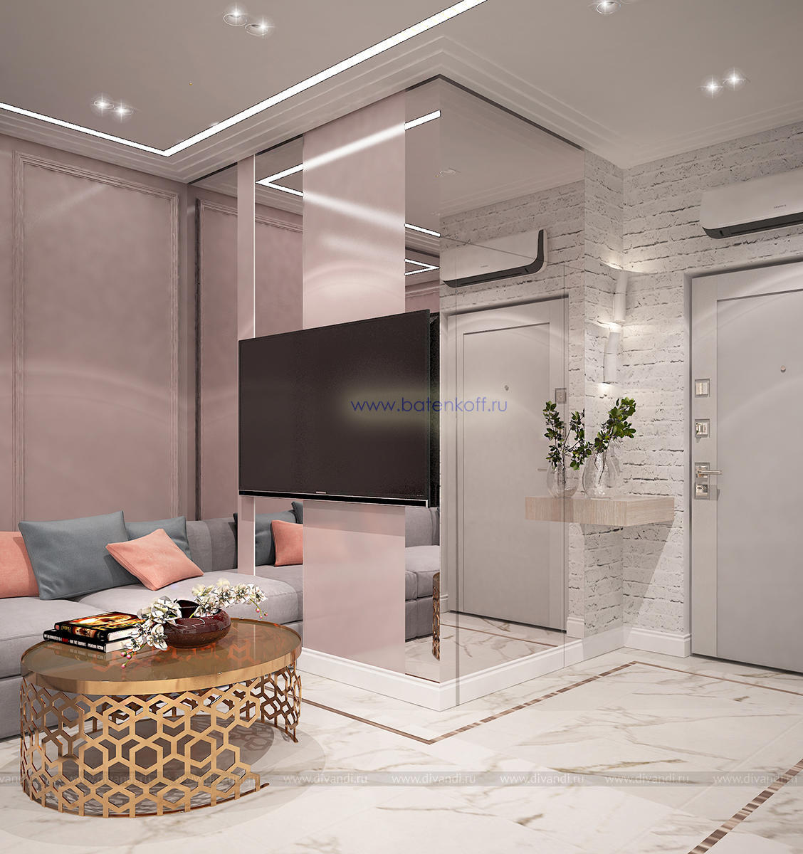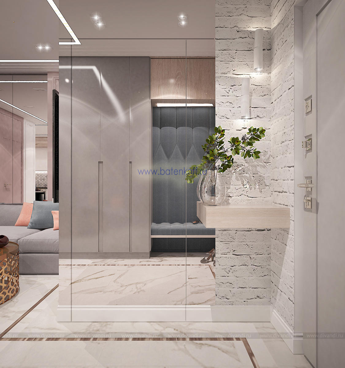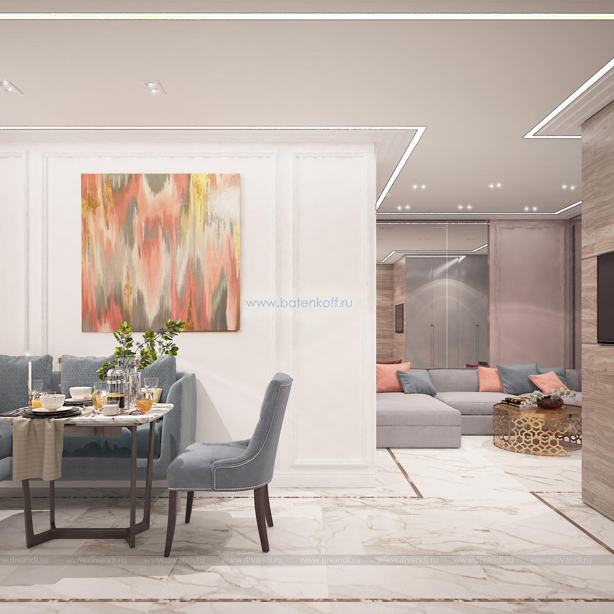 Интерьер квартиры выполнен в стиле современной классики с использованием белых и пыльно-розовых оттенков, а так же ярких акцентов в виде дерева, необработанного кирпича и текстиля ярких цветов. Помещения кажутся большими, просторными, благодаря панорамным окнам и обилию зеркал. В проекте использовались двери скрытого монтажа, благодаря чему интерьер получился более целостным. На создание элегантной, но вместе с тем по-уютному простой обстановки работают цвет, освещение, декор, меблировка.