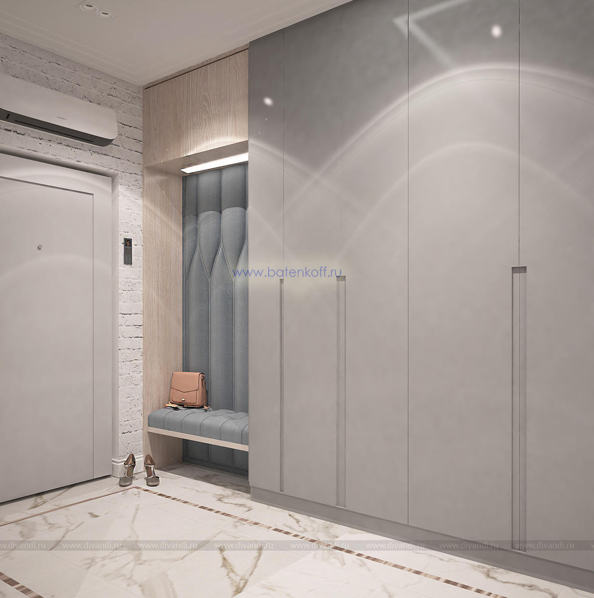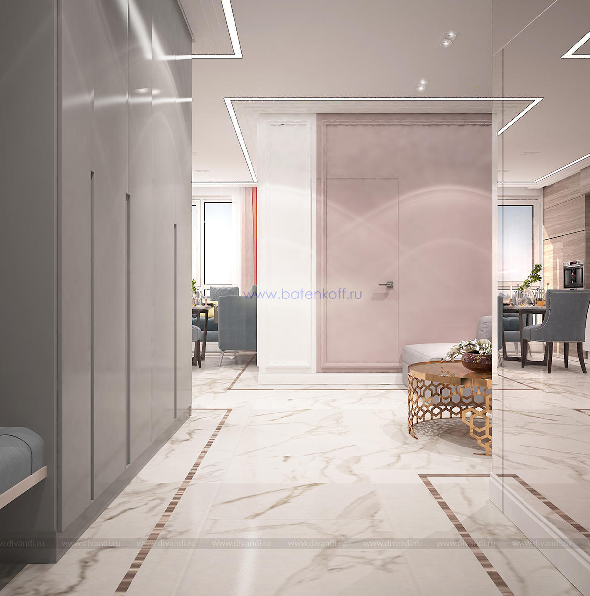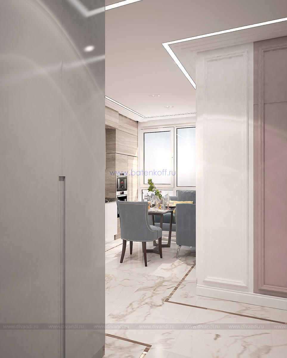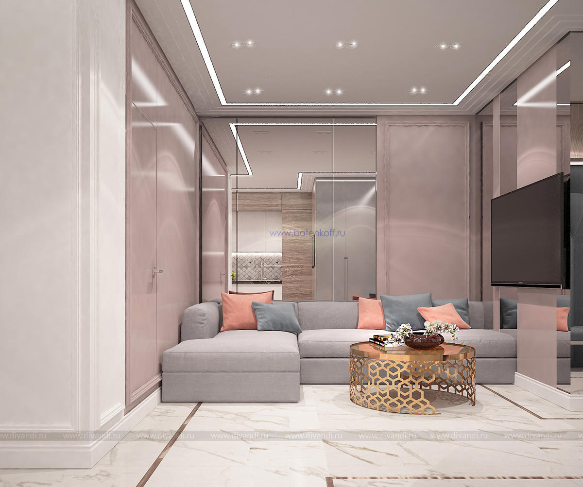 Интерьер квартиры выполнен в стиле современной классики с использованием белых и пыльно-розовых оттенков, а так же ярких акцентов в виде дерева, необработанного кирпича и текстиля ярких цветов. Помещения кажутся большими, просторными, благодаря панорамным окнам и обилию зеркал. В проекте использовались двери скрытого монтажа, благодаря чему интерьер получился более целостным. На создание элегантной, но вместе с тем по-уютному простой обстановки работают цвет, освещение, декор, меблировка.