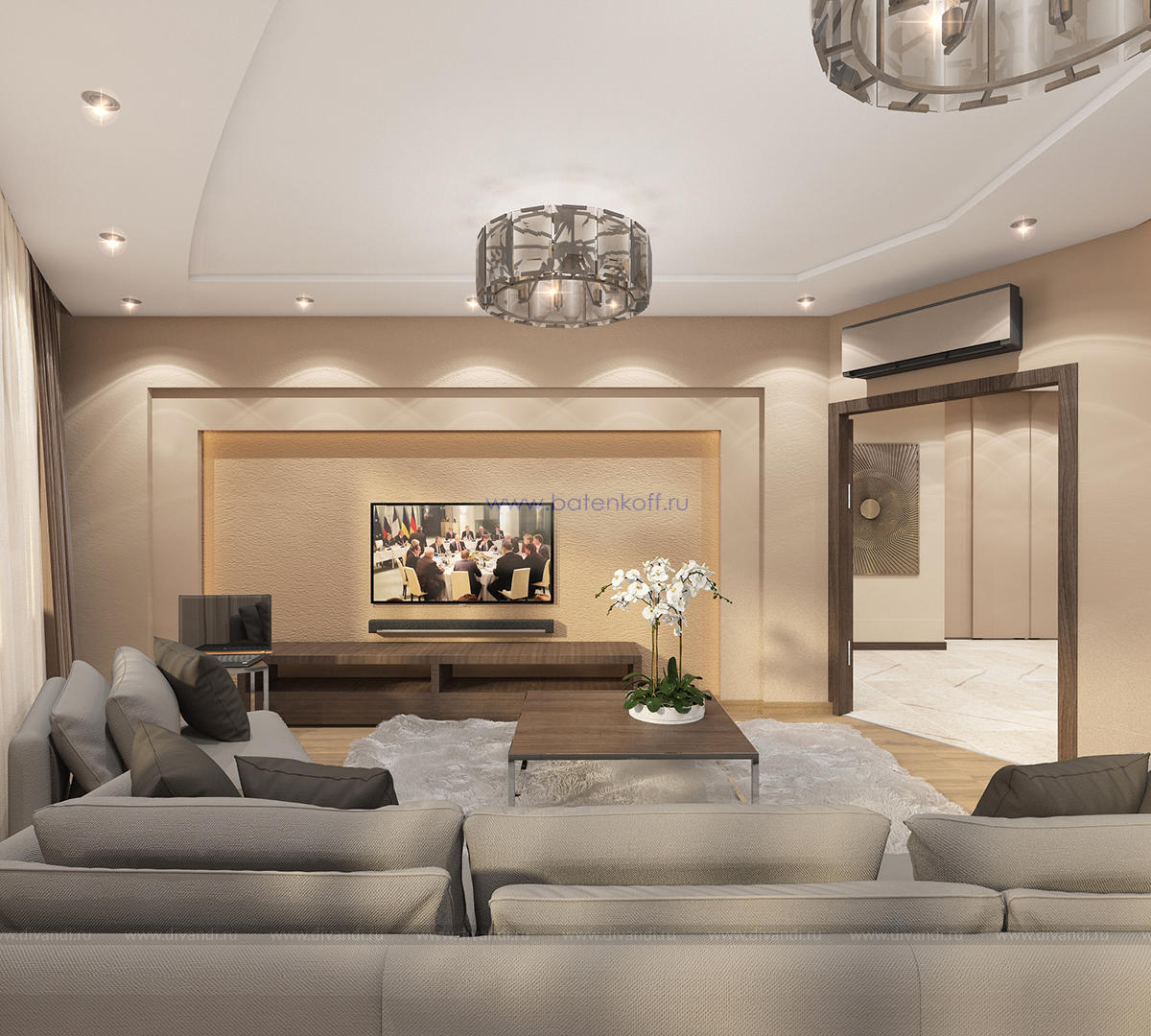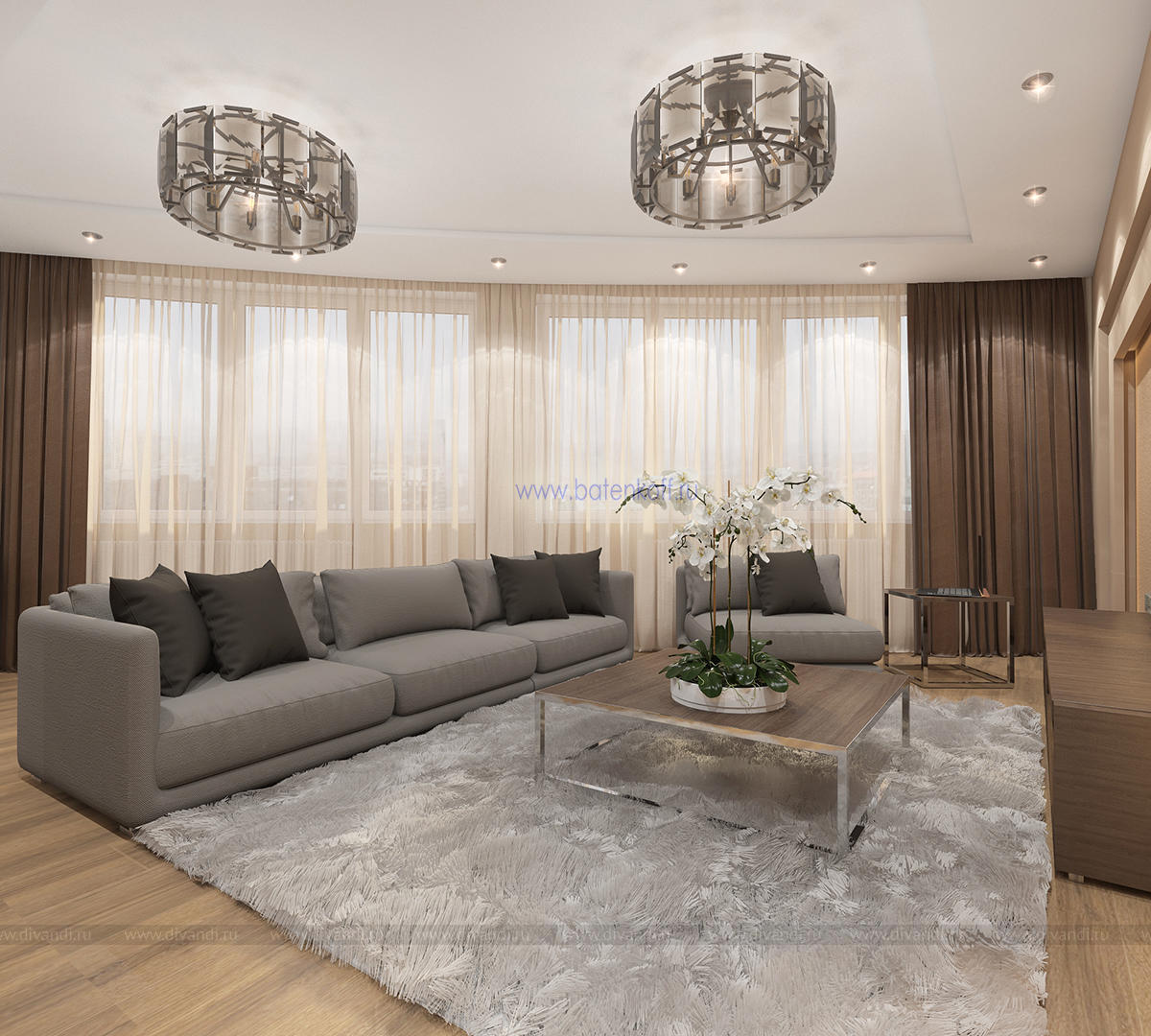 Мягкие, светлые оттенки наряду с лаконичными, прямыми линиями, характерными для современного стиля, добавляют интерьеру данной квартиры простора, воздушности, света. Планировка квартиры – классическая, выполнено четкое зонирование помещений: спальная комната, гостиная с кухней, ванная и гостевой санузел. Все материалы, использованные в отделке – натуральные и высококачественные. Элитная мебель, авторские предметы интерьера также выполнены из природных материалов – дерева, металла, камня, натуральных тканей.