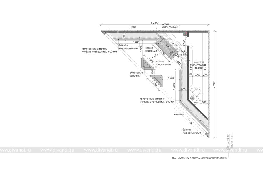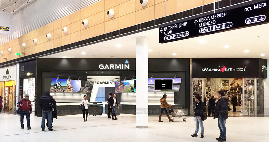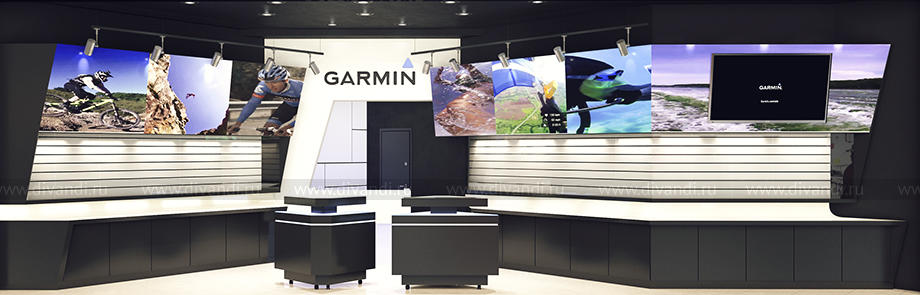 Дизайн интерьера магазина техники в СТЦ Мега-Новосибирск. Торговый зал с открытым фронтом и торговым оборудованием, специально разработанным под продукцию Garmin. Клиентская и кассовая зона совмещена с рабочими местами сотрудников.