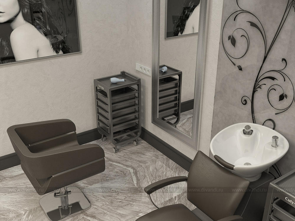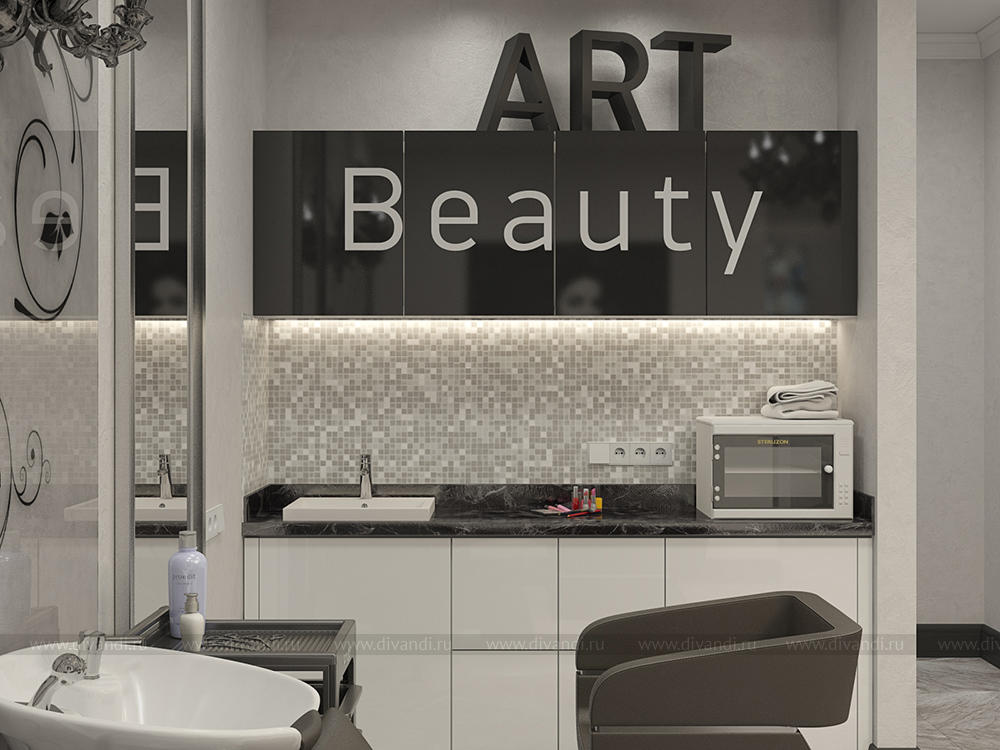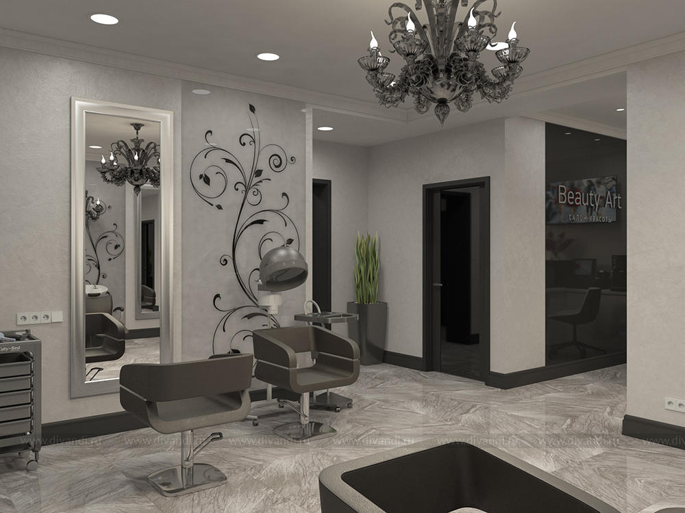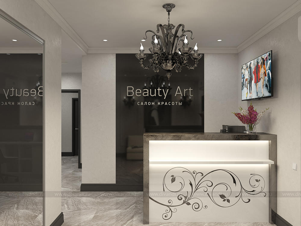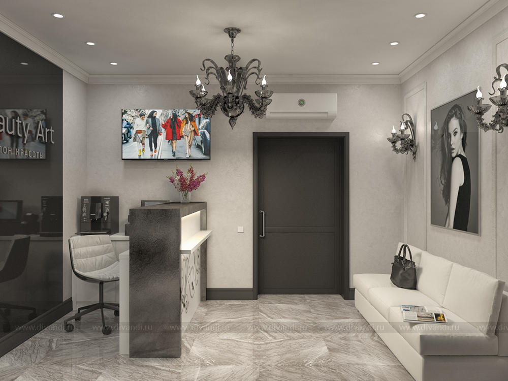 Дизайн интерьера салона выполнен в монохромных цветах. Глянцевые поверхности, объемные люстры, контрастные двери и плинтус создают модное и красивое пространство.