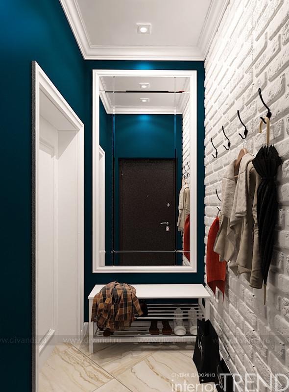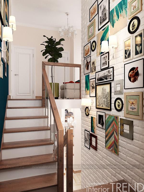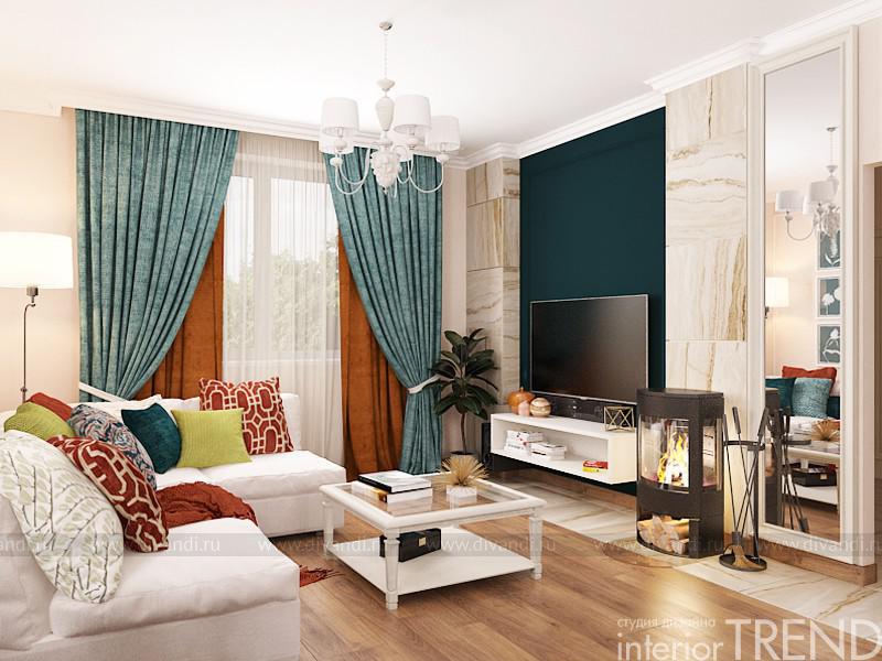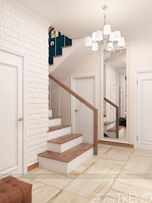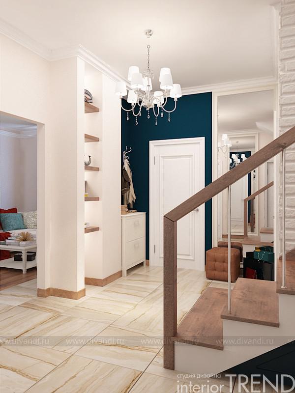 Очень красивый и уютный дом, который находится в К.П. «Золотая горка». Небольшой по площади, но абсолютно удобный по функционалу. Нам, как профессионалам дизайн студии InteriorTREND, осталось только выслушать все пожелания и преподнести дизайн идею. Так и получилось, все ненавязчиво и мягко, но при этом с яркими акцентами сложного сине-зеленого цвета. Интерьер получился и по-европейски современный и спокойный и гармоничный. Использовали немного декоративных материалов, но завязали их на всю общую зону. Отделка стен качественная и моющаяся краска, зеркала, также керамогранит под натуральный камень и декоративный кирпич. Такой прием объединения пространства, где с пола на стены переходит керамогранит, возник из задачи клиента. В гостиной находится настоящая каминная топка, естественно, что материалы вокруг нее должны соответствовать всем нормам безопасности. Поэтому их холла, пол перетекает в гостиную, а затем в зону кухни.
