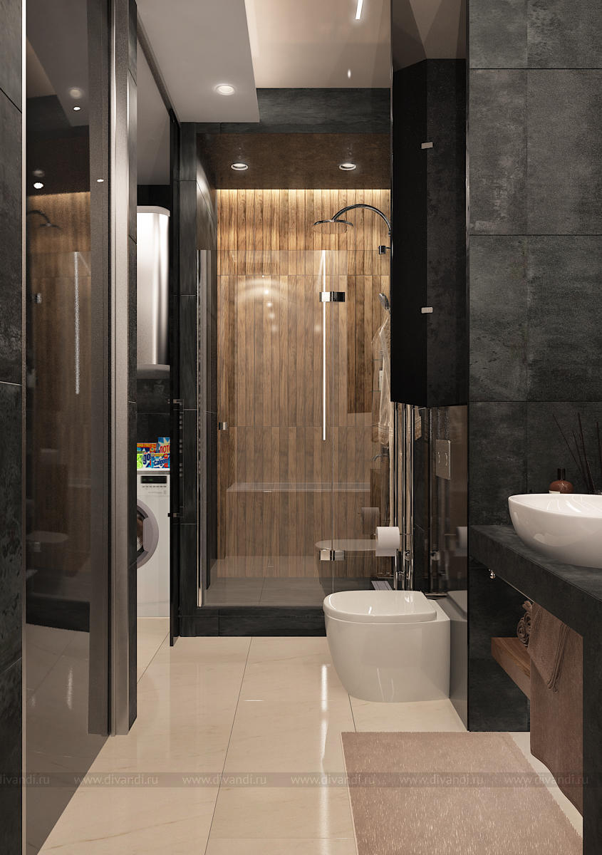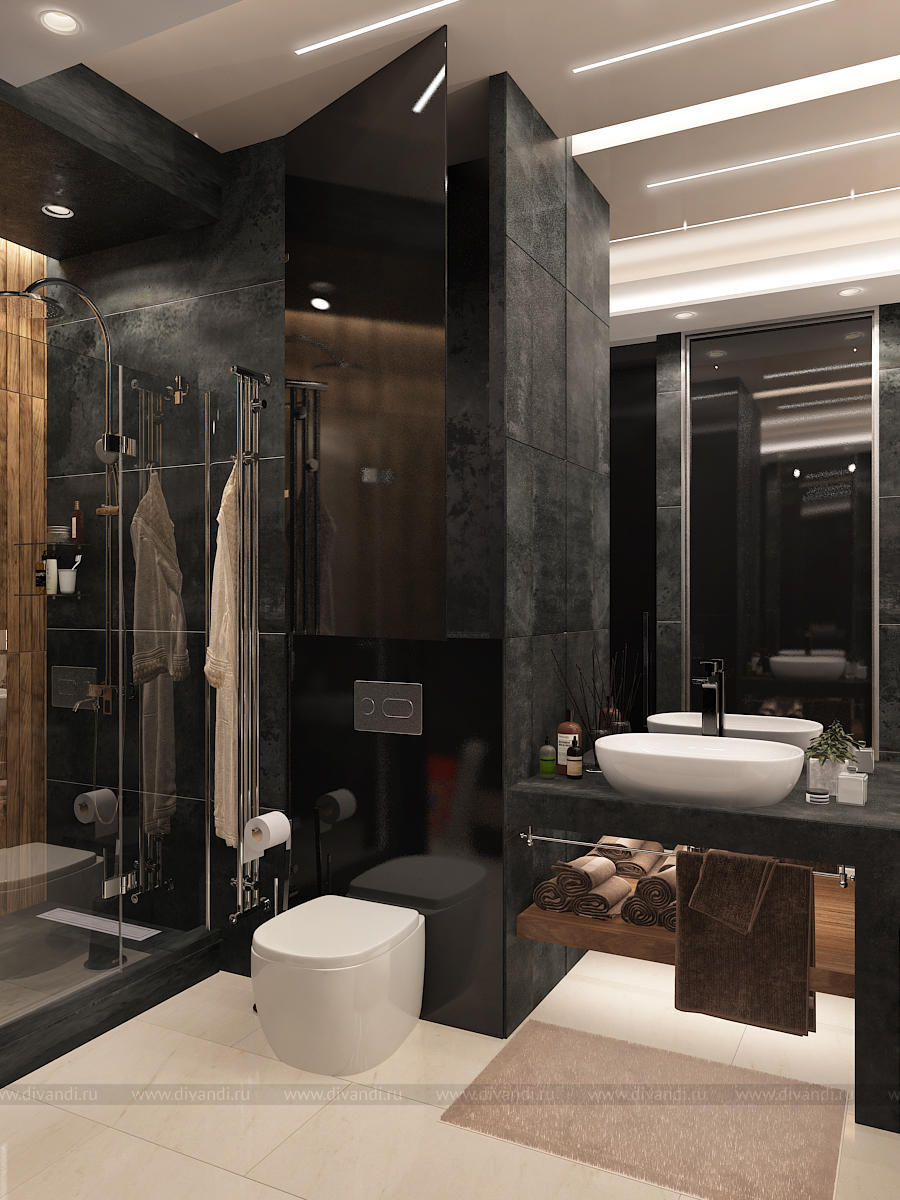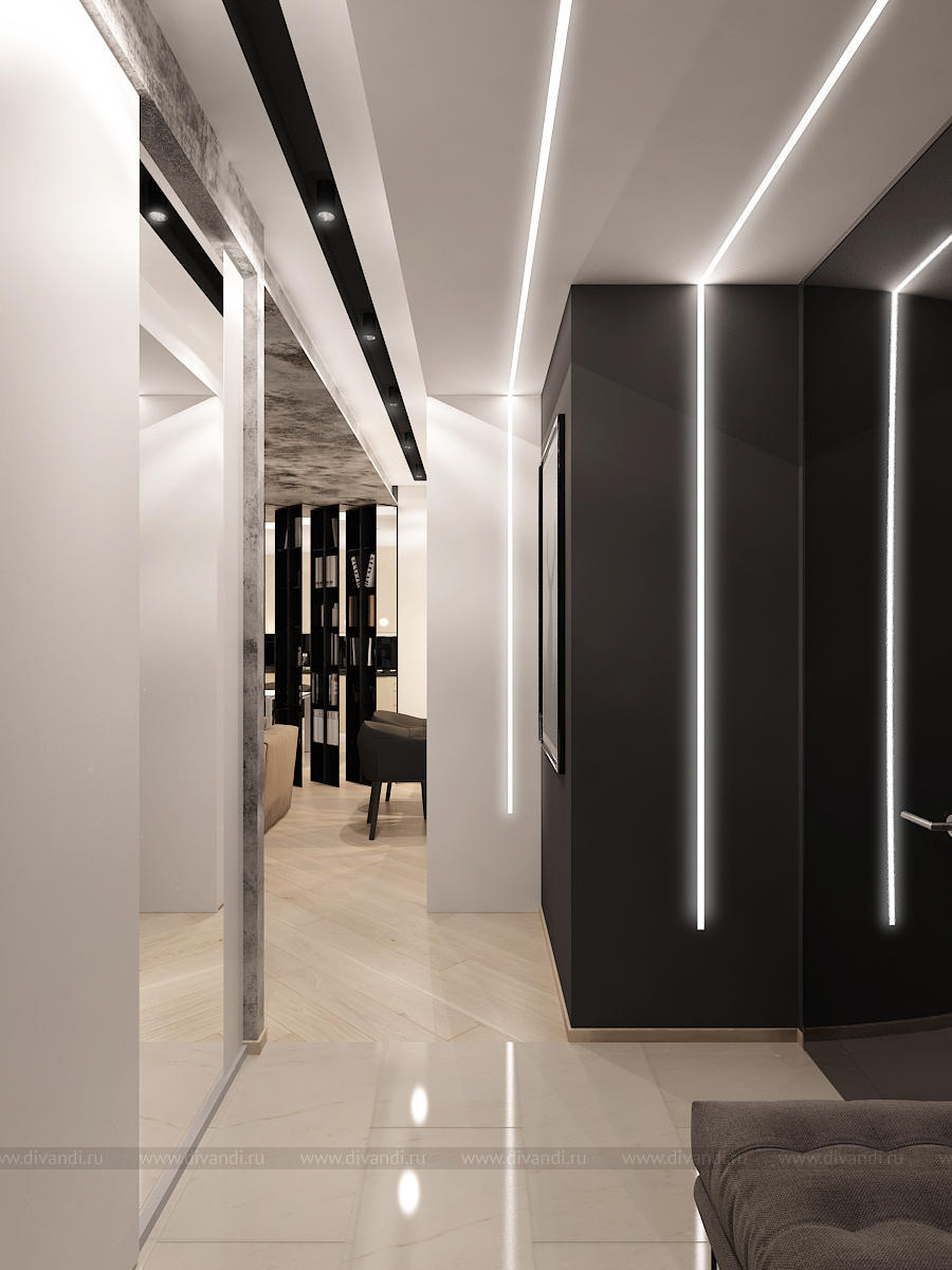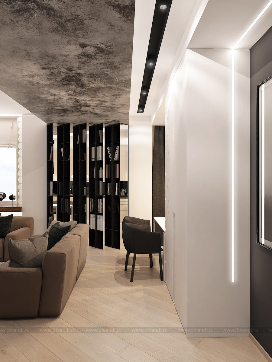 Мы использовали стекло, декоративную штукатурку, 3D панели, керамогранит, зеркало, дерево, гладкие и матовые поверхности. Все это разнообразие компенсируется минимальным наличием цветовой гаммы. Архитектура пространства тоже имеет сложные конструктивные узлы и переходы. Такой микс требует грамотного подхода в работе над дизайн-проектом. Мы старались не нарушить баланс, гармонию и композицию, поэтому интерьер смотрится графично и эффектно. Каждая точка и каждый ракурс раскрывает пространство по-новому.