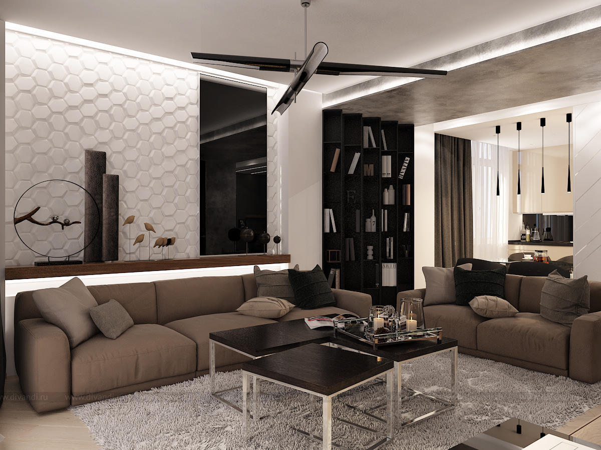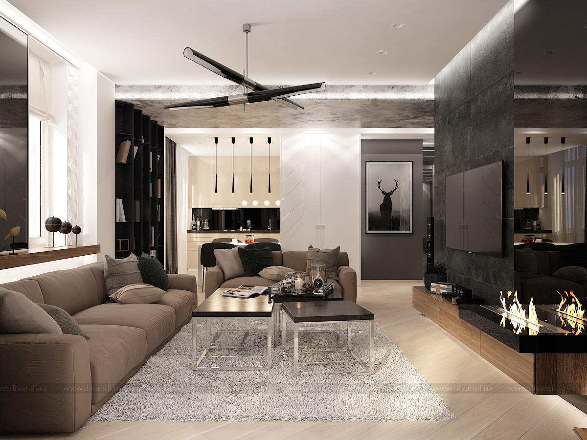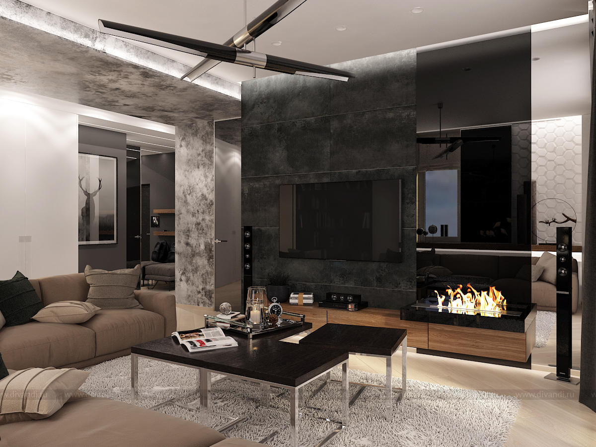 Данный интерьер получился динамичным, разнофактурным, с множеством деталей.