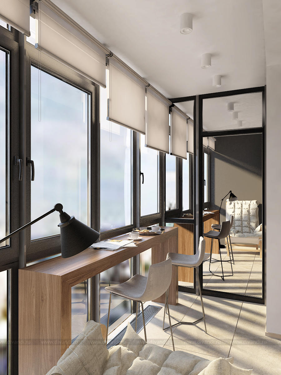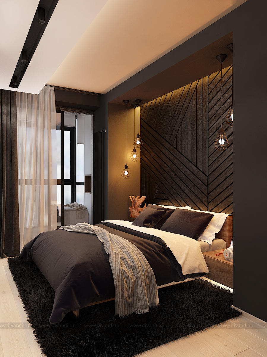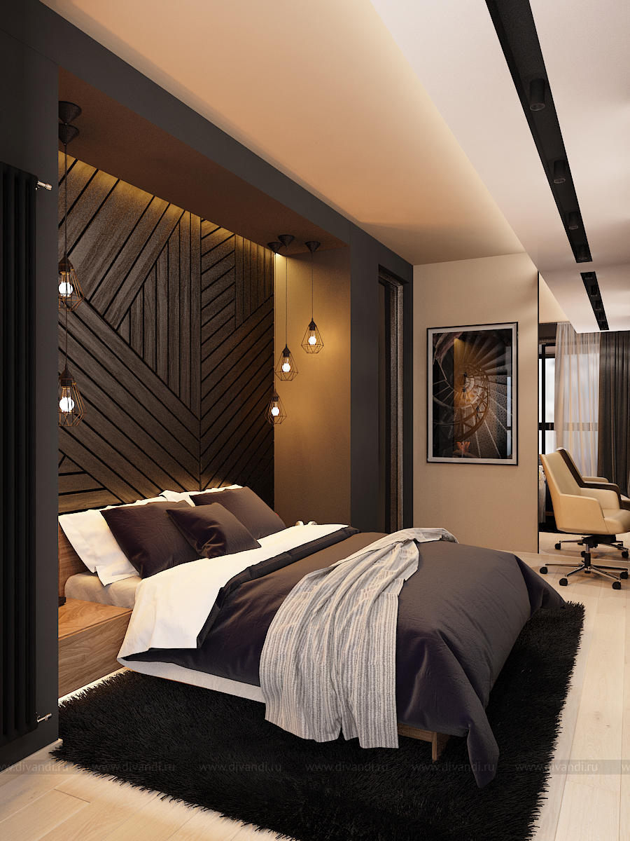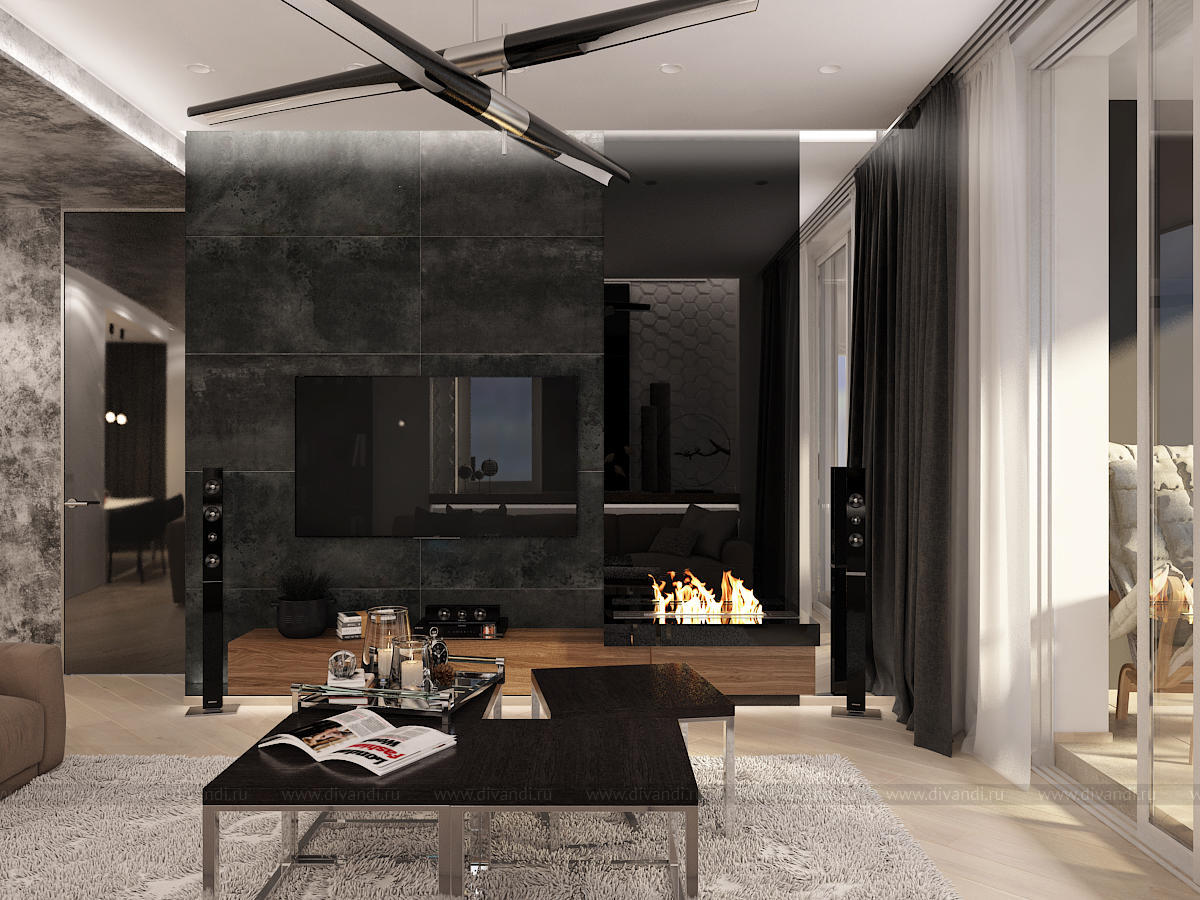 Данный интерьер получился динамичным, разнофактурным, с множеством деталей.