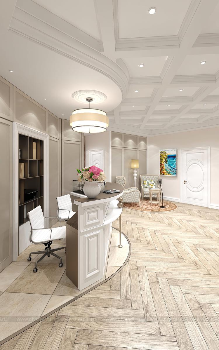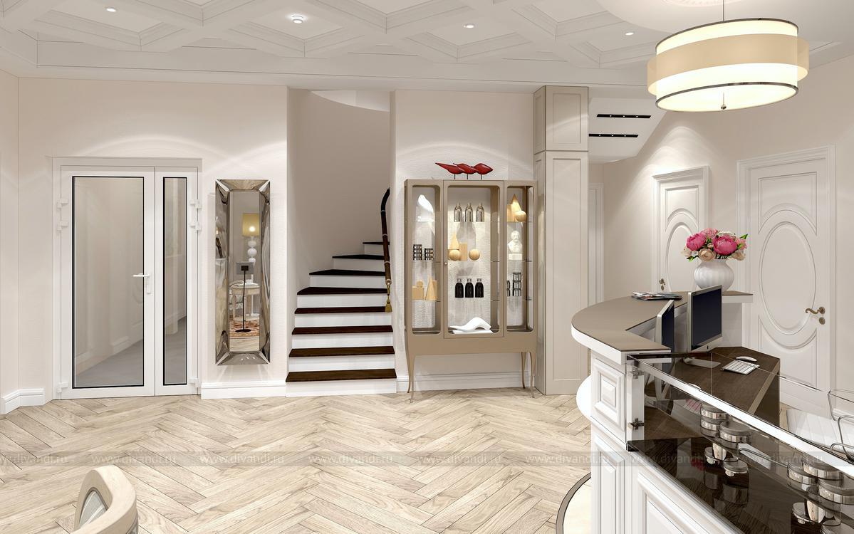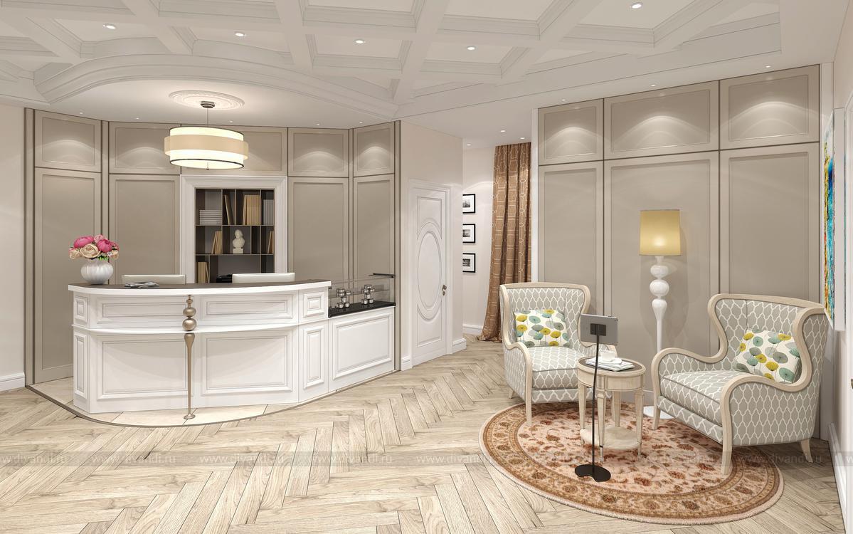 Интерьер данной косметологической клиники в классическом стиле: в данном варианте мы использовали светлые оттенки, чтобы акцентировать внимание на чистоте и аккуратности.