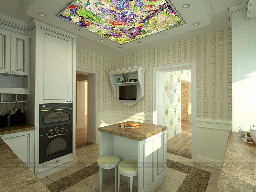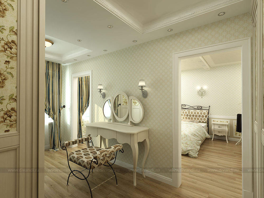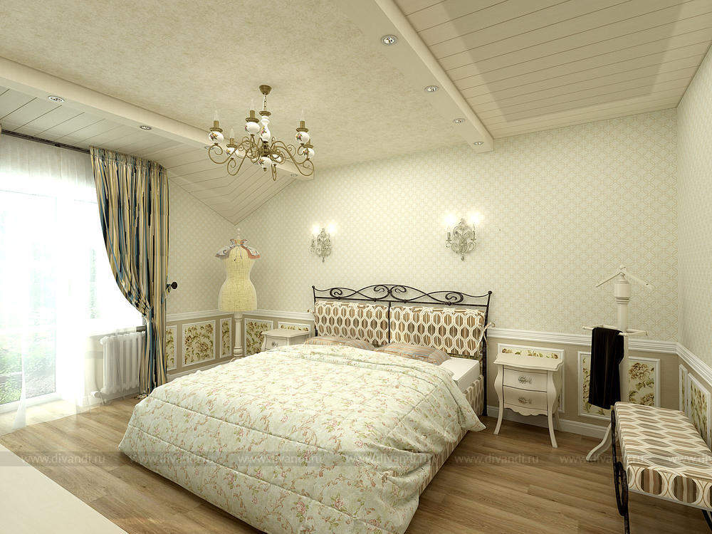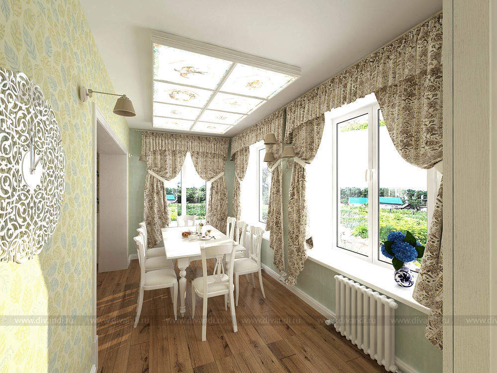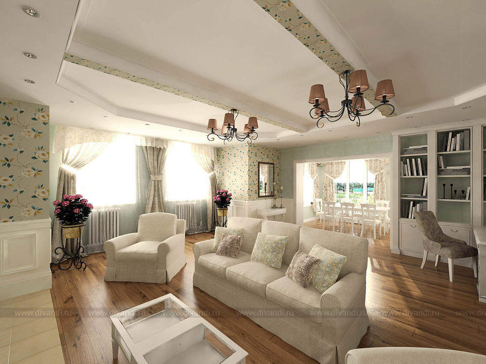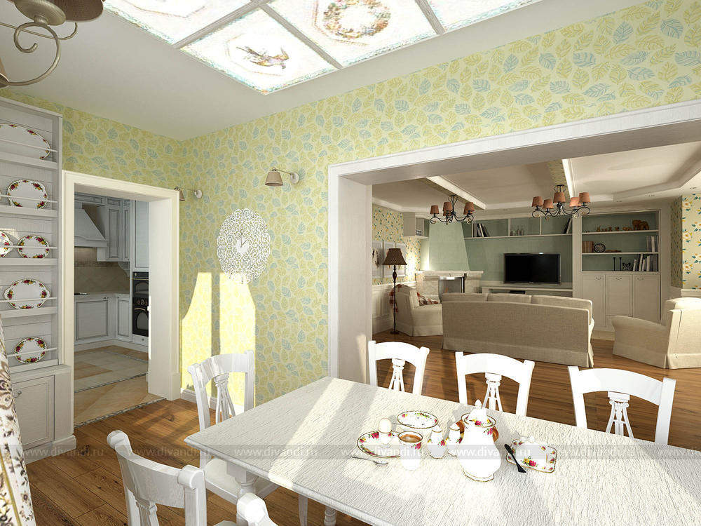Стиль уютного прованса подошел как нельзя лучше для коттеджа в черте города. Легкие романтичные цвета, обои с растительным орнаментом, натуральные отделочные материалы вносят свежести в помещения и позволяют забыть, что вы находитесь в шумном городе.