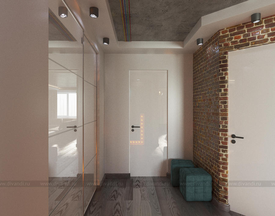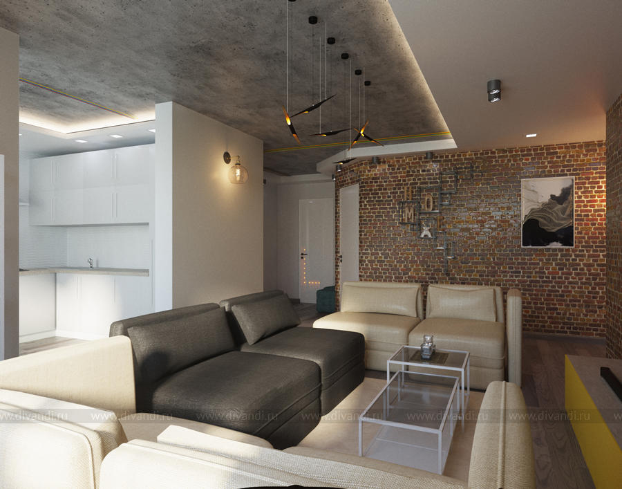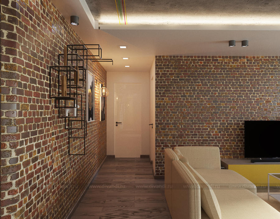Так или иначе этот стиль трудно уместить в малогабаритных низких помещениях, предназначенных для жизни и проект к завершению претерпел много изменений. Комнаты стали уютнее, стиль переродился в современный с элементами кирпича, амбарной доски, функциональной мебели и теплыми оттенками.