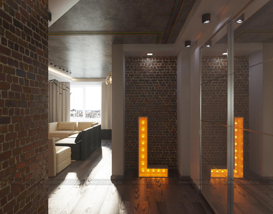 Сначала атмосферу Loft создали, внеся в отделку состаренный кирпич, бетонные потолки с открытой цветной проводкой, отделку пола под состаренную доску.
