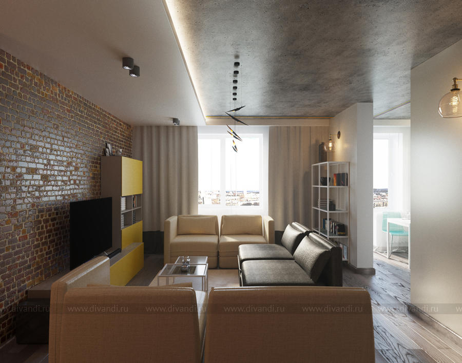 Loft принято разбавлять блеском металла или мягкими тканевыми фактурами, вносящими в этот грубоватый стиль уют и атмосферу отдыха. В этом интерьере такую роль выполняют яркие локальные цвета, желтый, бирюзовый, белый глянец.