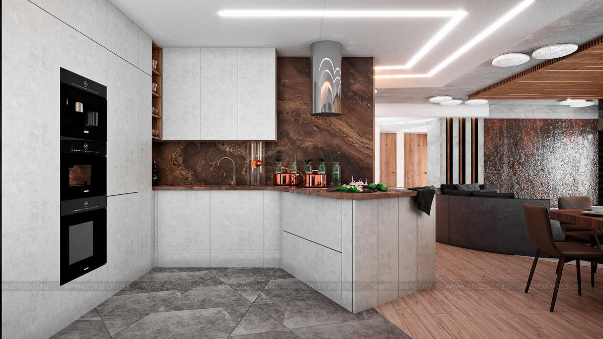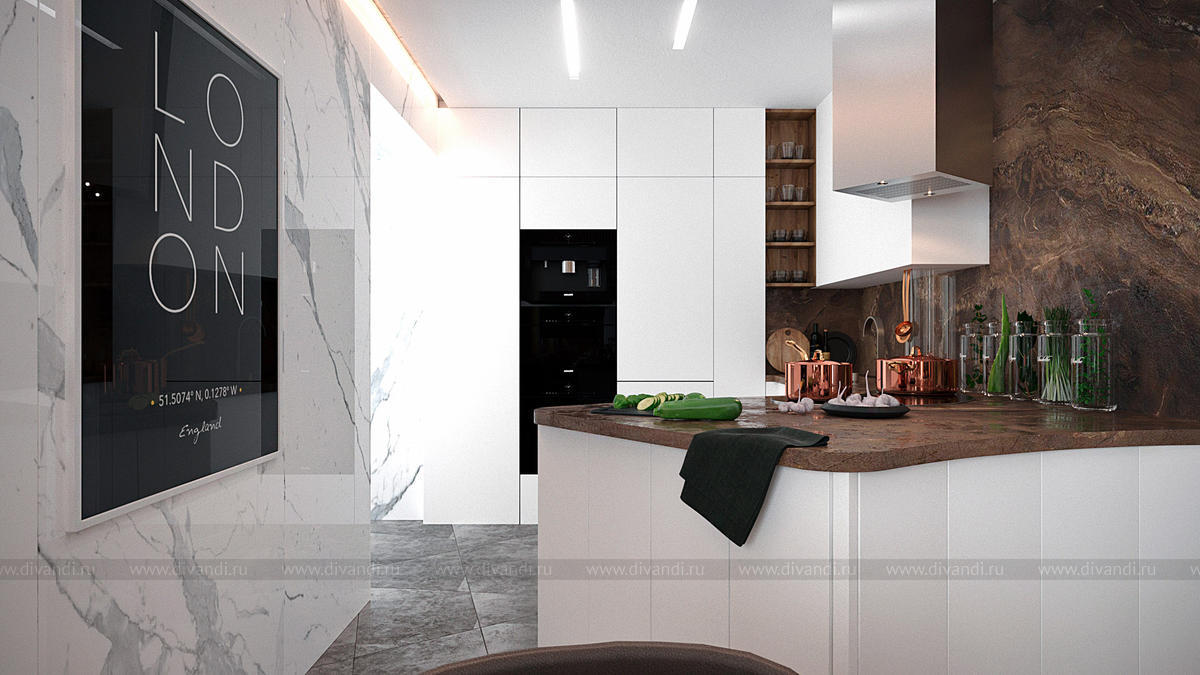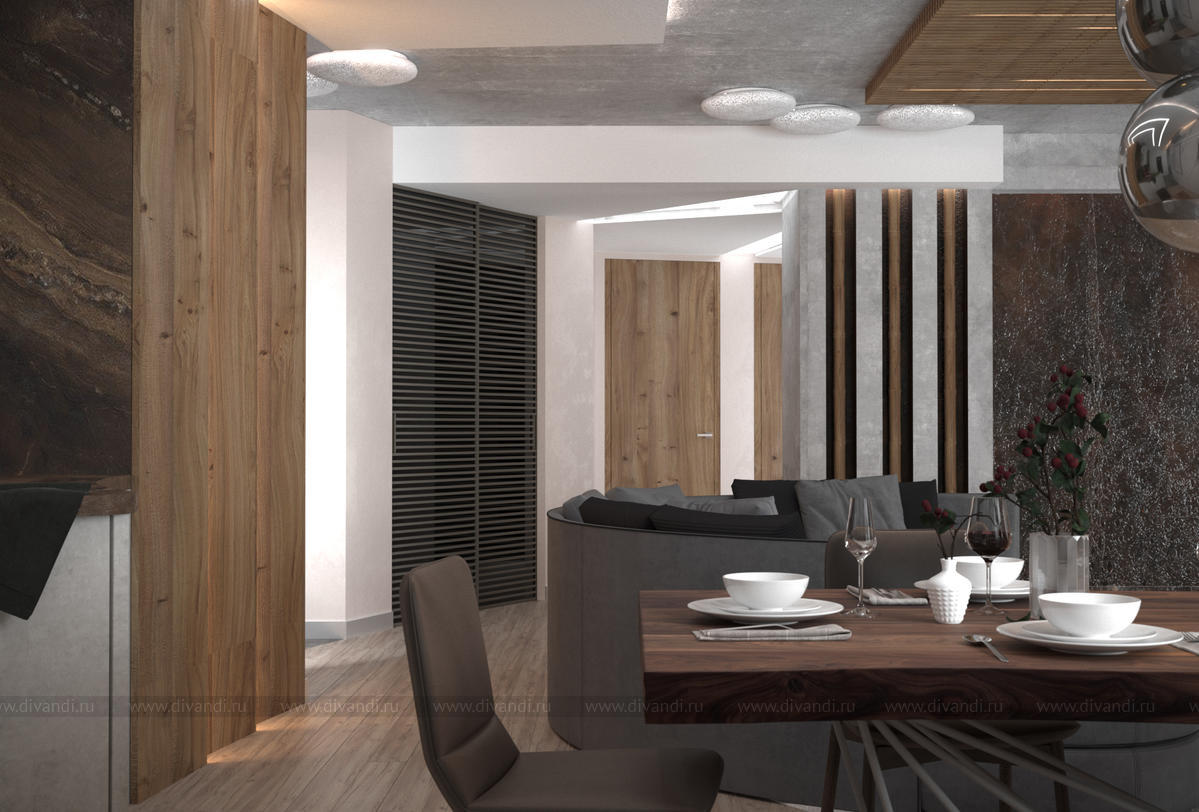 Комната - студия в 4-х комнатной квартире включает гостиную, кухню и прихожую. Все помещения объединены единой стилистикой и плавно перетекают друг в друга. В отделке использованы самые современные тенденции и технологии.