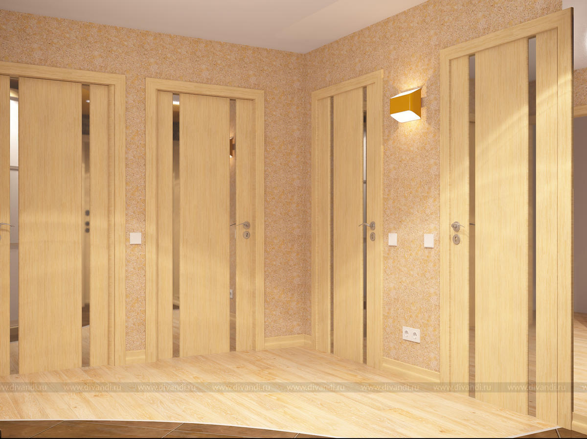 Дизайн-студия Goldiz разработала дизайн интерьера коридора на удаленной основе. Сложность состояла в том, что в коридоре на небольшой площади располагалось 6 дверных проемов. Нужно было их обыграть. Было рассмотрено 2 варианта : в светлых и темных тонах. Заказчику понравился больше 2 вариант. Изогнутый потолок был изначально. Поэтому было решено подчеркнуть его радиусным шкафом.