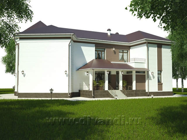 Разработка дизайна фасадов коттеджа включала также и проектирование двух крылец - на главном фасаде и на заднем. Также был выполнен проект забора вокруг участка.