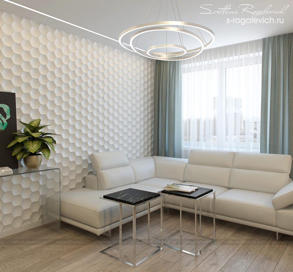 В интерьере использованы лаконичные формы, превалируют спокойные цвета, которые разбавлены геометрическими контрастными акцентами.