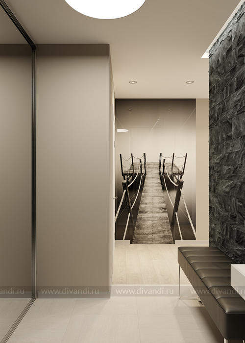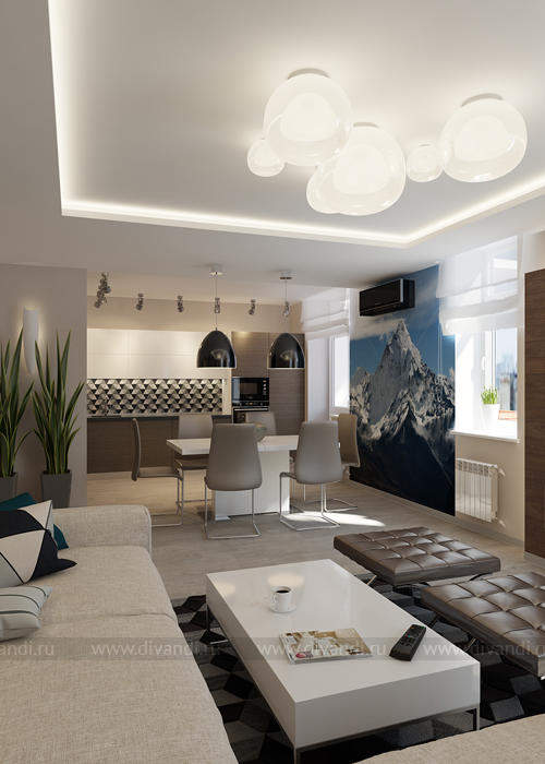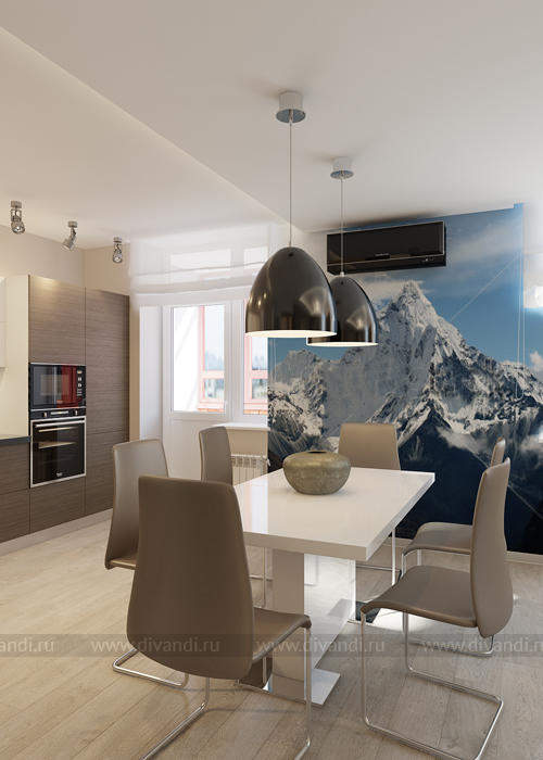 С прекрасным видом на нижне исетское водохранилище. Вид из окна и увлечённость заказчика горнолыжным спортом и скалолазанием определили стиль этого интерьера. Заказчик любит природу, свежий воздух и горные пейзажи! По этому мебели в квартире по минимуму что бы максимально оставить воздух! Именно для увеличения пространства мы объединили кухню и гостиную. При входе в квартир мы видим панно – фото обои с с видом перспективы, на самом деле там спрятан старый проем в кухню, который мы оставили и за ним скрывается стиральная машина! Во всем интерьере мы видим цвета взятые с горно пейзажа на фото обоях в зале, это натуральные цвета природных оттенков, это камень, синий цвет плитки на фартуке, дерево в интерьере! С спальне за изголовьем кровати гипсовые панели Артполе, на стене за тв Декоративная штукатурка имитирующая бетон. Ванная комната в легких бирюзовых тонах с печатью на стекле в зоне ванной.