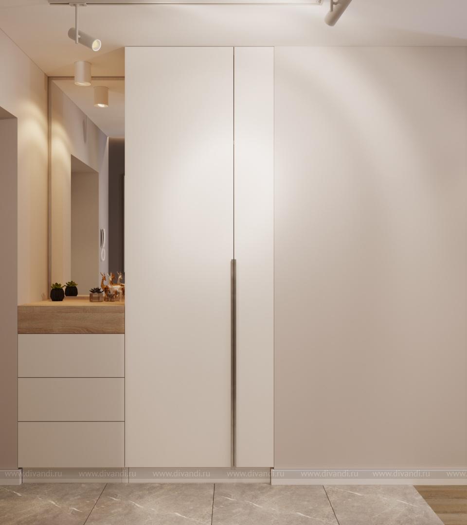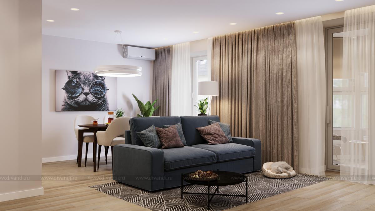 Лаконичный проект двухкомнатной квартиры в современном стиле выполнен преимущественно в однотонной, пастельной цветовой гамме. За счет сложных оттенков, присутствующих в отделке помещений, достигается особый интерес и глубина пространства. Акценты создаются за счет глубоких цветов мебели: темно-синий цвет дивана в гостиной зоне и ярких деталей - бросская картина на стене. В спальне использованы постельные тона, приглушенная подсветка и белый, почти незаметный, шкаф - все это создает спокойную атмосферу, погружающую в отдых и расслабление.