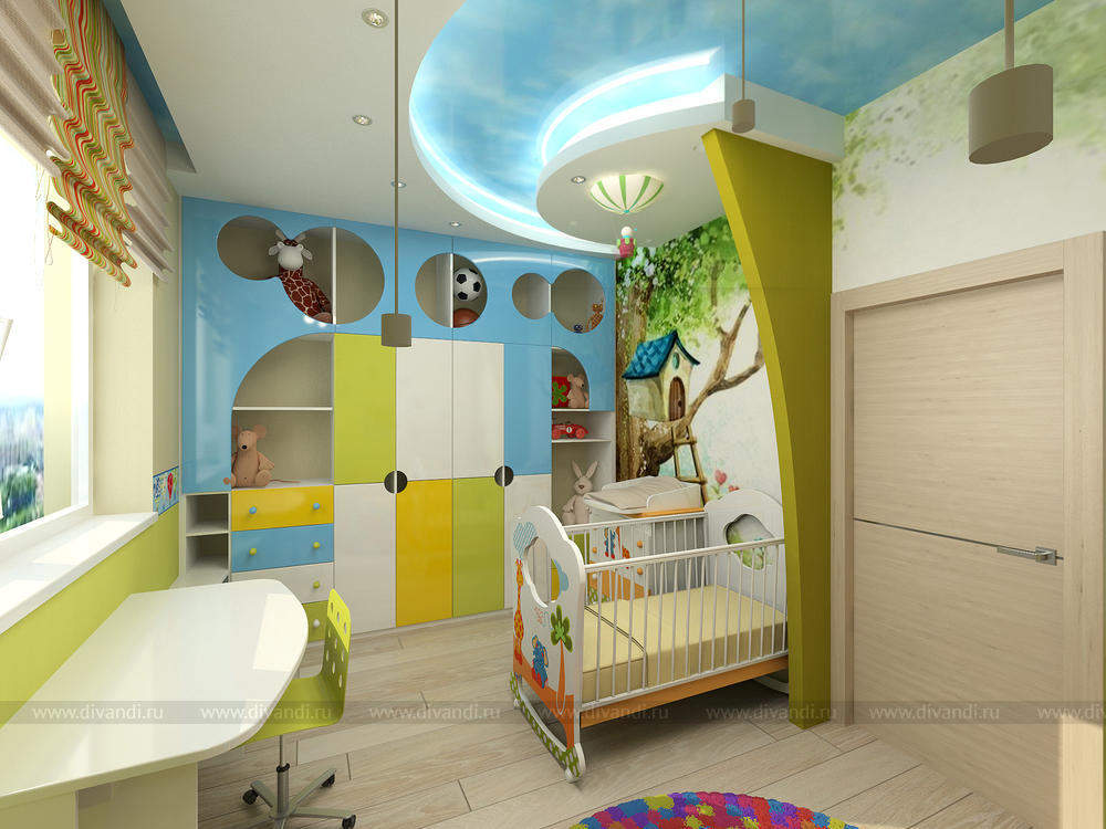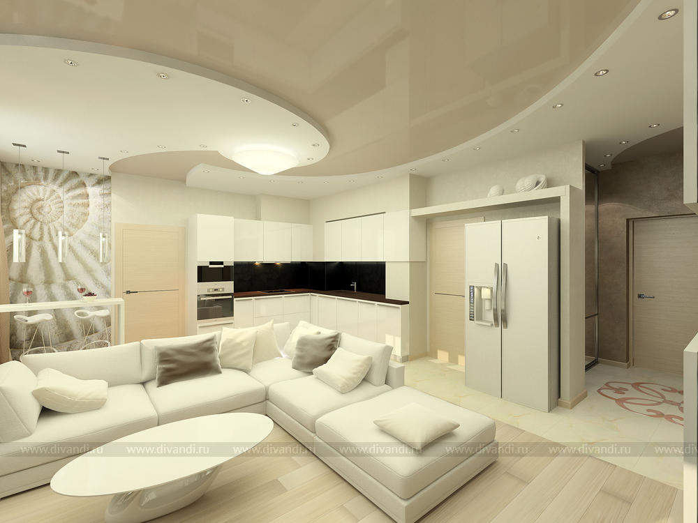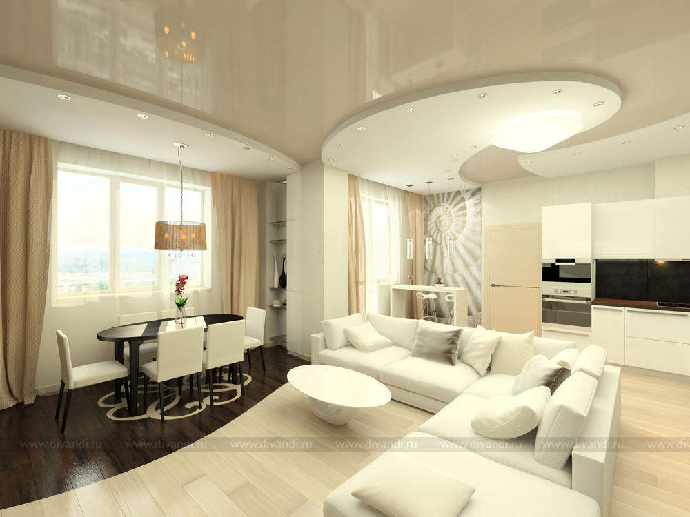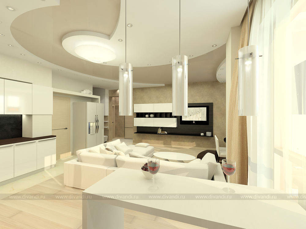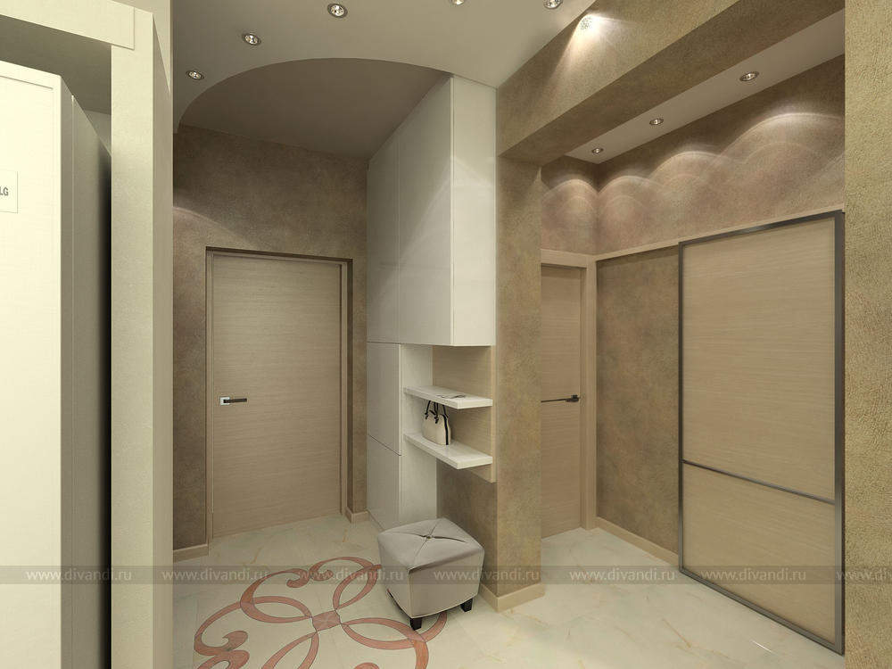 Дизайн интерьеров квартиры выполнен в нежных бежевых тонах. В качестве акцентов использованы темные цвета. Примечательна композиция потолка - в основу лег образ улитки, спирали, которая затягивает благоденствие, достаток и удачу в эту семью. Детская, выполненная в ярких тонах, предназначена для новорожденного малыша с перспективой на вырост. В отделке использованы различные штукатурки, элементы с фотопечатью, неординарный черный керамогранит.